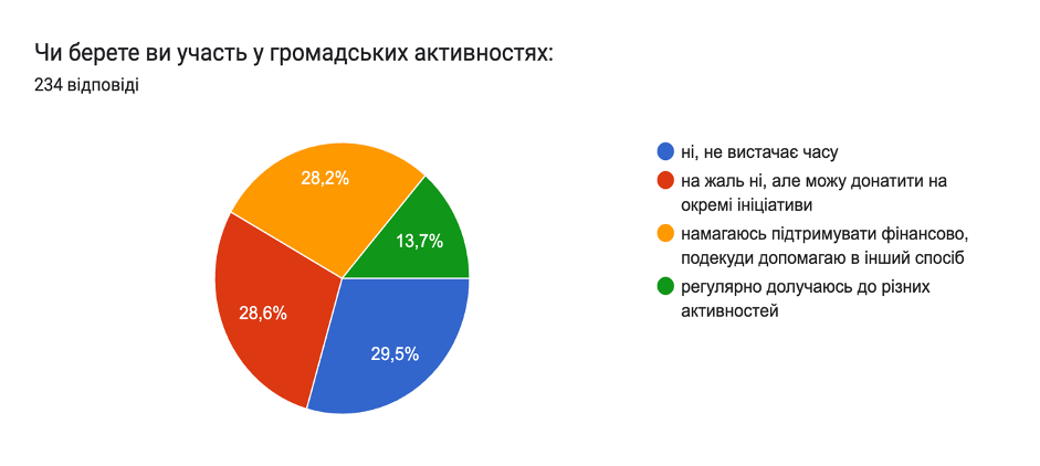 3. 56,8% респондентів не беруть участь у громадських активностях. Натомість 13,7% респондентів є активними учасниками різних ініціатив.