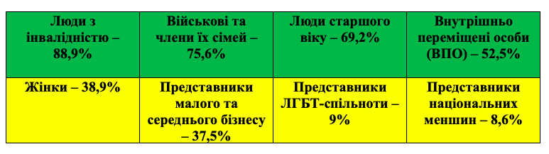 7. Щодо оцінки потреб у соціальній підтримці найбільш виражених вразливих груп населення було визначено, що найбільшої допомоги потребують наступні групи: люди з інвалідністю, військові та члени їх сімей, люди старшого віку та внутрішньо переміщені особи (ВПО). Тоді як менше допомоги потребують: жінки, представники малого та середнього бізнесу, ЛГБТ-спільнота та представники національних меншин.