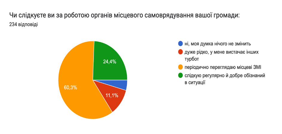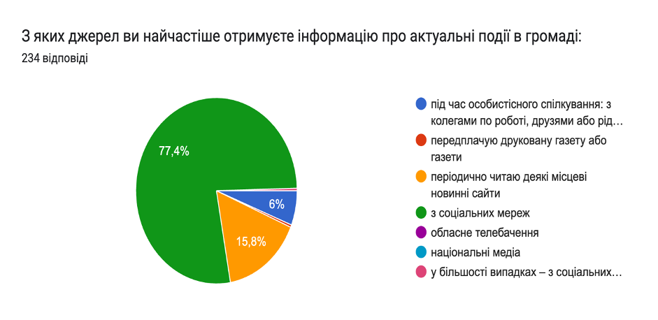 5. 24,4% респондентів регулярно слідкують за важливими подіями в громаді. 77,4% опитаних зазначають, що отримують інформацію новинного характеру про події в громаді з соціальних мереж й лише 15,8% при тому підписані на локальні новинні сайти.