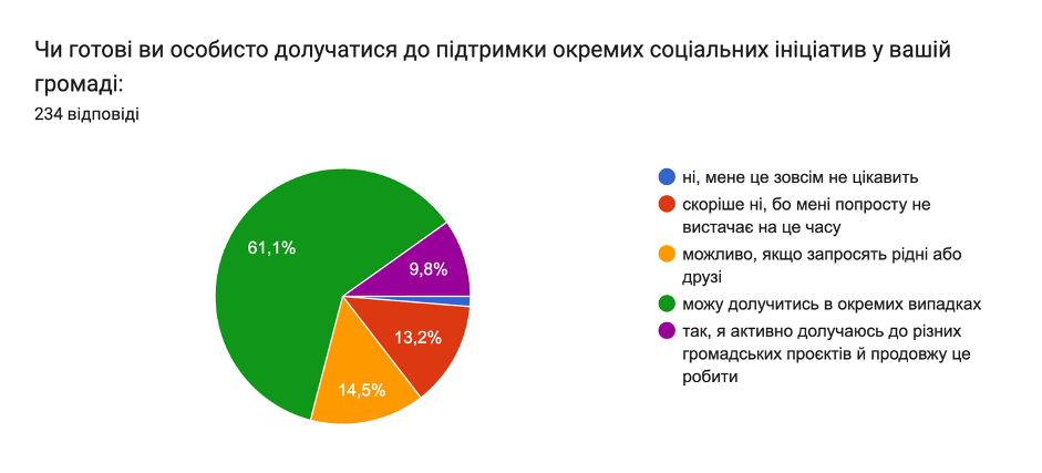 9. 9,8% респондентів активно долучаються до різних громадських ініціатив й планують це робити в майбутньому. 61,1% можуть долучитись в окремих випадках. 14,5% готові долучатись лише у тому випадку, якщо їх запросять рідні або друзі. Тільки 14,5% скептично налаштовані.