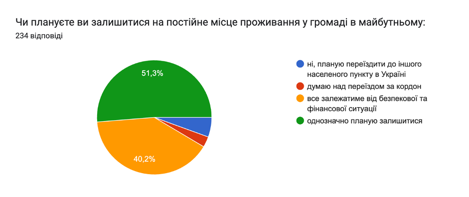 10. Ще один позитивний сигнал пов'язаний з тим, що 51,3% респондентів зазначили, що «однозначно планують залишитись на постійній основі в громаді». 40,2% зробили поправку на безпекову ситуацію. 5,6% прагнуть переїхати до іншої громади в межах України й лише 3% готуються до переїзду до іншої держави.