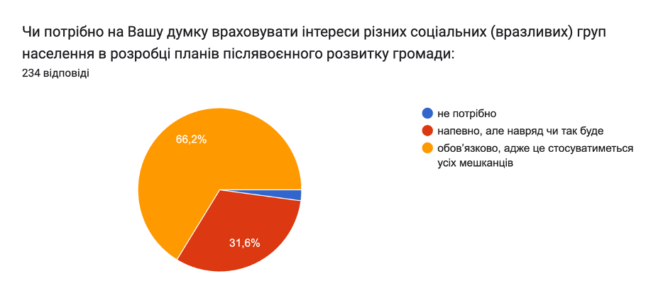 8. 66,2% респондентів зазначили, що місцева влада повинна враховувати інтереси різних соціальних (вразливих) груп населення перед прийняттям важливих рішень. При тому тільки 33,8% налаштовані скептично з цього приводу – вважають, що їх думки навряд будуть враховуватись. В цілому це позитивна динаміка, адже скептично налаштованих мешканців громади приблизно 1/3, що свідчить про високий потенціал залучення громадськості до процесів розвитку.