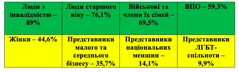 7. Щодо оцінки потреб у соціальній підтримці найбільш виражених вразливих груп населення було визначено, що найбільшої допомоги потребують наступні групи: люди з інвалідністю, люди старшого віку, військові та члени їх сімей та внутрішньо переміщені особи (ВПО). Тоді як менше допомоги потребують: жінки, представники малого та середнього бізнесу, представники національних меншин та ЛГБТ-спільнота.