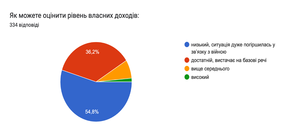 2. 54,8% респондентів оцінили власний рівень доходів, як низький, зокрема, через військові дії. 36,2% зазначили, що мають достатній рівень доходів, який дозволяє закривати базові життєві потреби. 7,5% опитаних зазначили рівень доходів як «вище середнього» й лише 1,5% респондентів вважають, що мають високі показники доходів. Показники оцінки економічної ситуації в громаді критичні. Одна з базових причин – ведення бойових дій у відносній близькості до громади та тривала окупація значної частини Харківської області, що негативно вплинуло на економічну ситуацію та рівень доходів громадян.