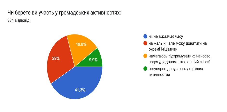 3. 70,3% респондентів не беруть участь у громадських активностях. Натомість 9,9% респондентів є активними учасниками різних ініціатив. Фактично високий рівень громадської активності демонструють майже 10% респондентів.