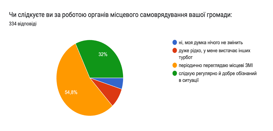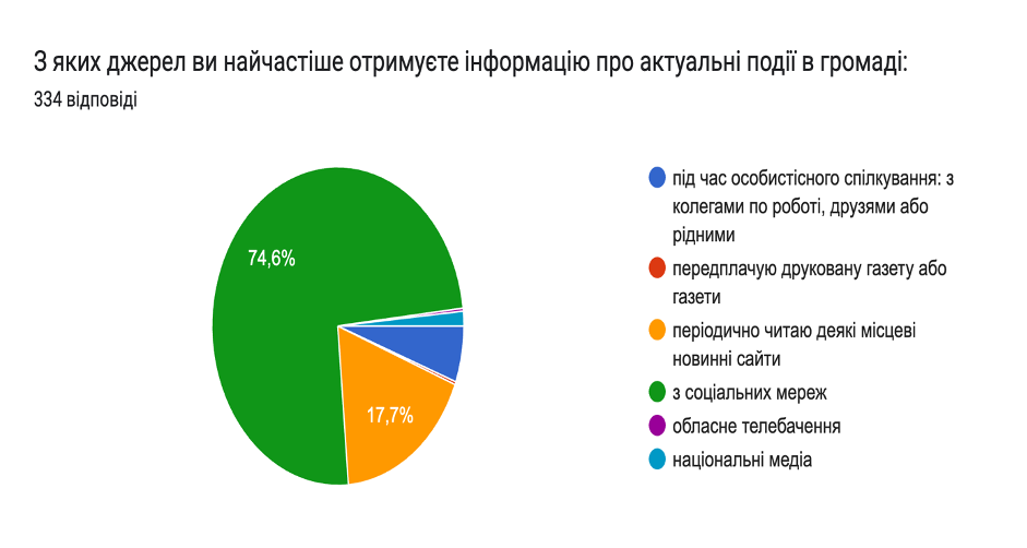 5. 32% респондентів регулярно слідкують за важливими подіями в громаді. 74,6% опитаних зазначають, що отримують інформацію новинного характеру про події в громаді з соціальних мереж й лише 17,7% при тому підписані на локальні новинні сайти.