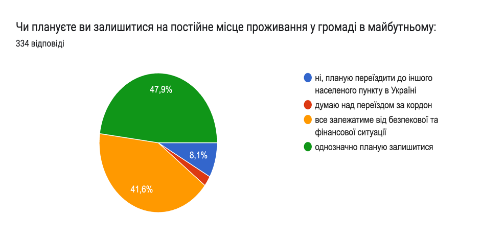 10. Ще один позитивний сигнал пов'язаний з тим, що 47,9% респондентів зазначили, що «однозначно планують залишитись на постійній основі в громаді». 41,6% зробили поправку на безпекову ситуацію. 8,1% прагнуть переїхати до іншої громади в межах України й лише 2,4% готуються до переїзду до іншої держави.