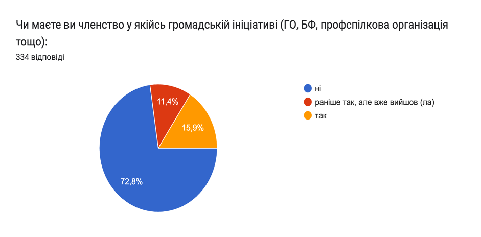 1. Тільки 15,9% респондентів визначили свою приналежність до будь-якого формату громадських організацій чи ініціатив, тоді як 72,8% не мають таких горизонтальних зв’язків. Це свідчить про низький рівень кооперації мешканців в аспекті громадського життя та недостатню кількість дієвих громадських ініціатив.