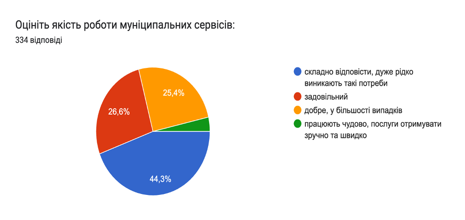 6. Щодо оцінки роботи муніципальних сервісів, то лише 29% респондентів визначили цей аспект в площині «позитивно» або «скоріше позитивно». 26,6% оцінили на задовільному рівні, а для більшості респондентів важко відповісти на це питання через те, що вони не часто користуються відповідними послугами – 44,3%.