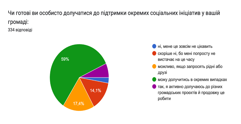 9. 6,9% респондентів активно долучаються до різних громадських ініціатив й планують це робити в майбутньому. 59% можуть долучитись в окремих випадках. 17,4% готові долучатись лише у тому випадку, якщо їх запросять рідні або друзі. Тільки 16,8% скептично налаштовані.