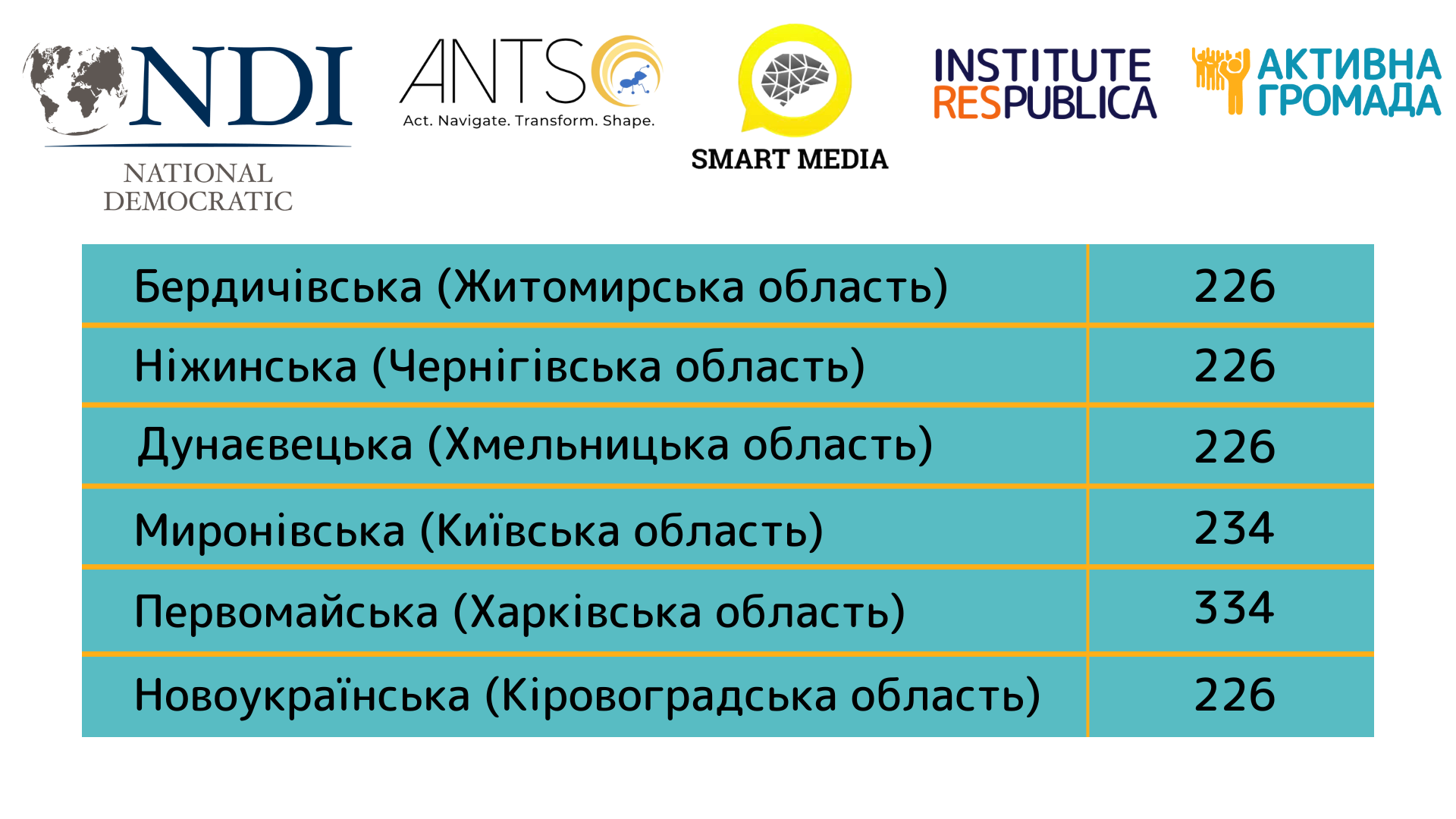 Завершено реалізацію 6 досліджень у громадах-партнерах в межах проєкту «Моделі участі в українській реконструкції», який реалізується «Мережею захисту національних інтересів ANTS» за участі Інституту «Республіка», ВІ «Активна Громада» та «Смарт Медіа» під егідою «Національного Демократичного Інституту» (NDI).