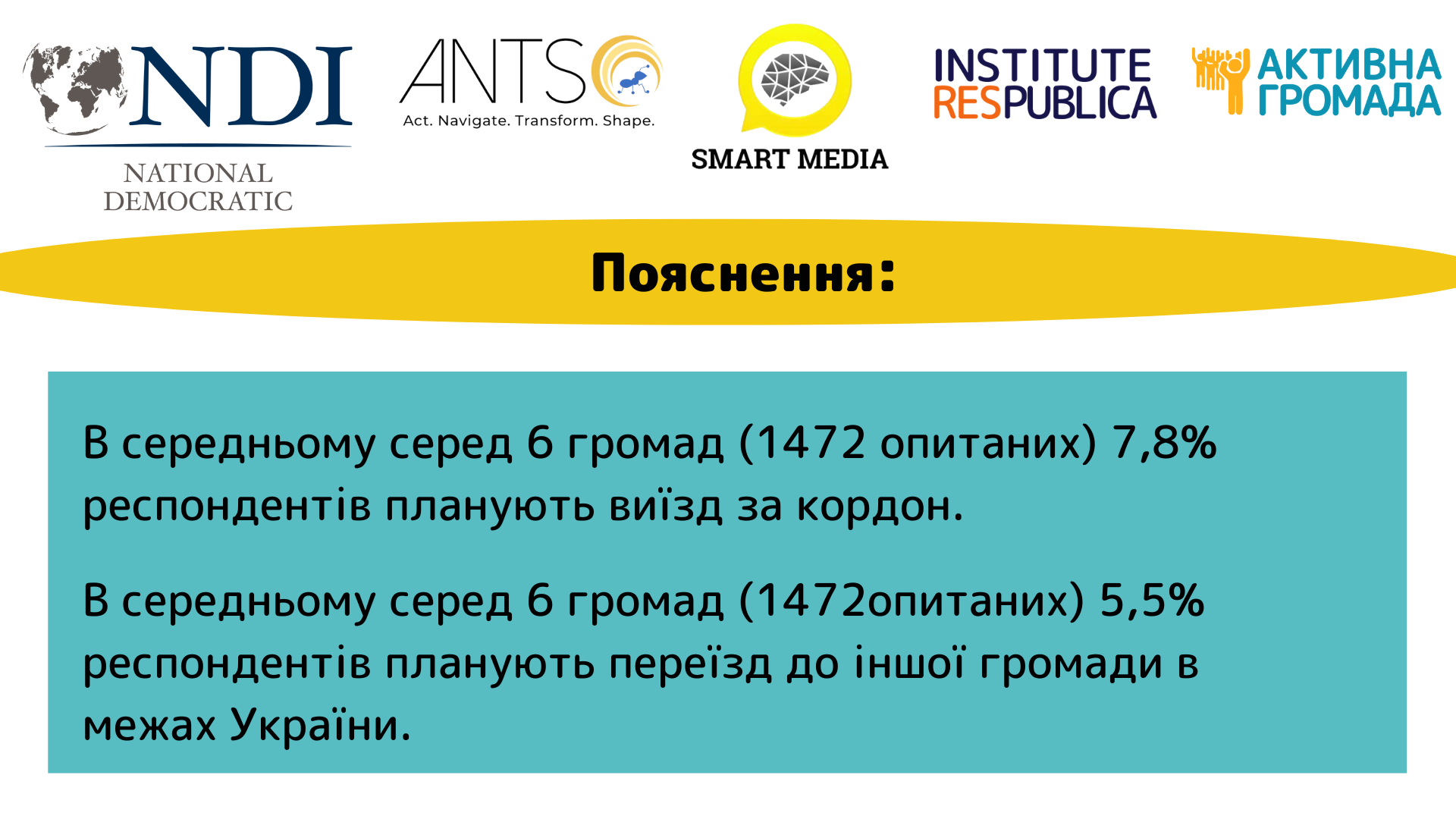 | Громада | % людей, які планують переїхати на постійне місце проживання до іншої громади в межах України | % людей, які планують виїзд за межі України |
