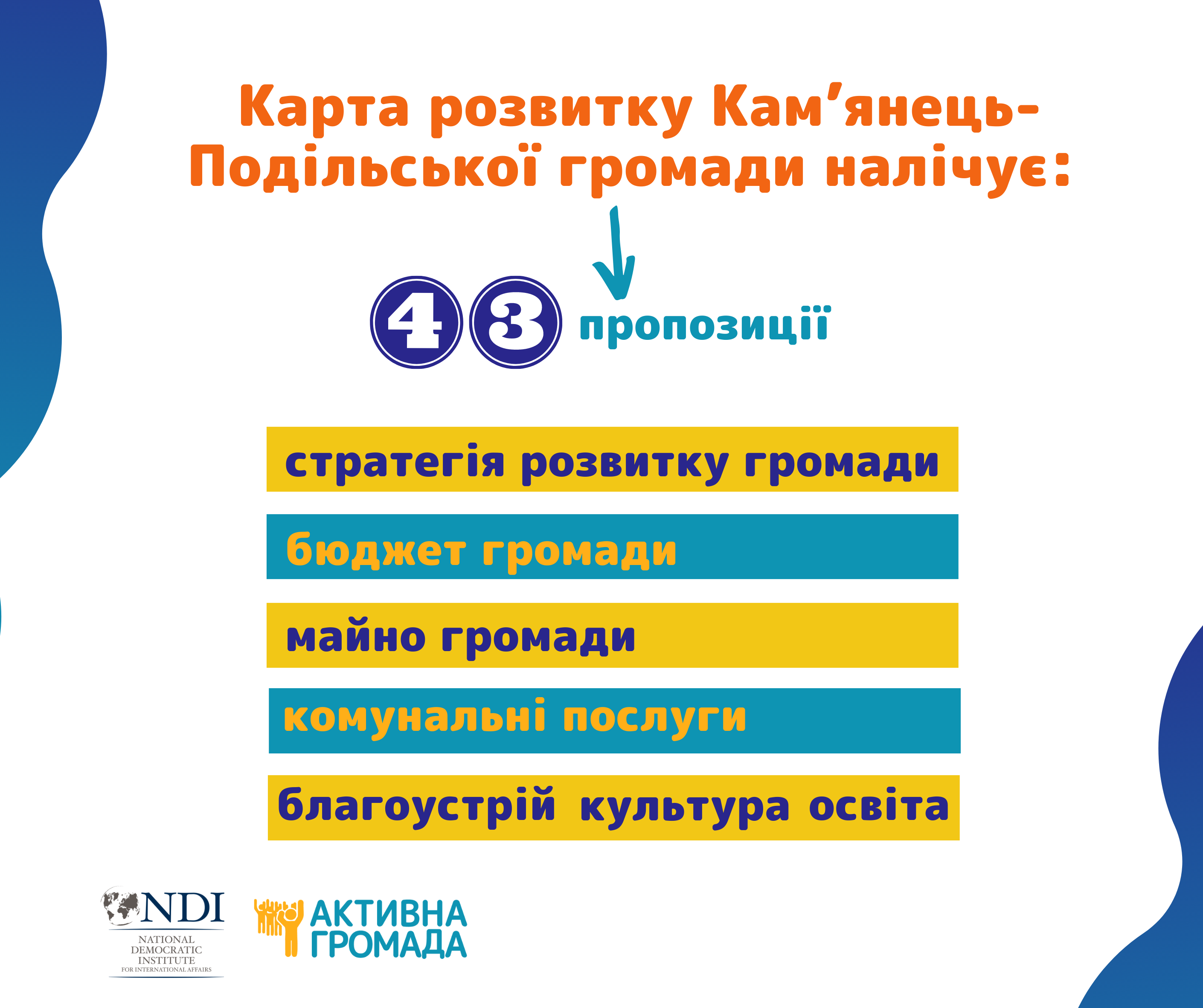 Сформована Карта містить 43 пропозиції, які сформовані по 8 напрямках: стратегія розвитку громади, бюджет громади, майно громади, комунальні послуги, благоустрій, освіта, медицина, культура.