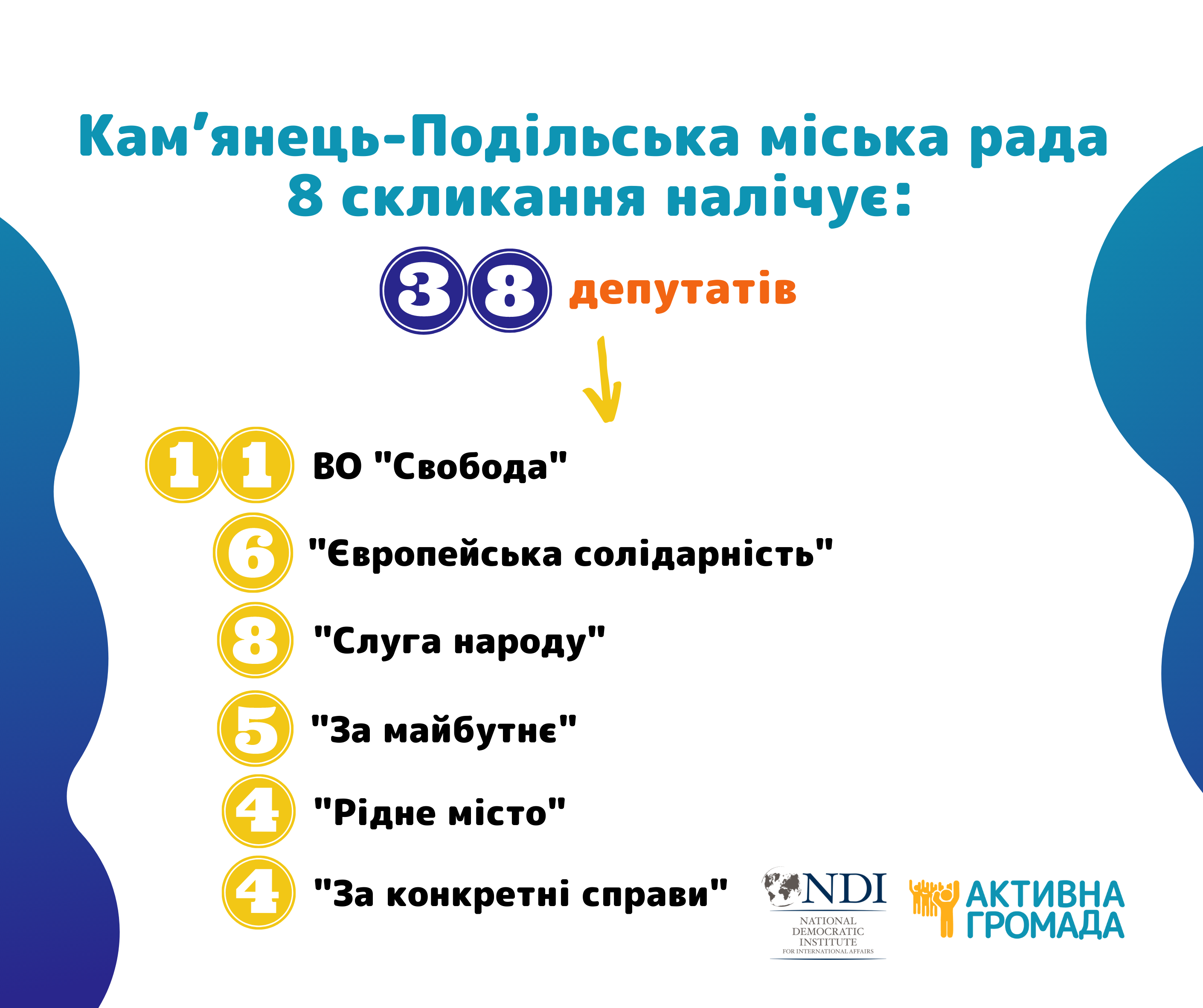 Кам’янець-Подільська міська рада восьмого скликання налічує 38 депутата/депутаток, з них: