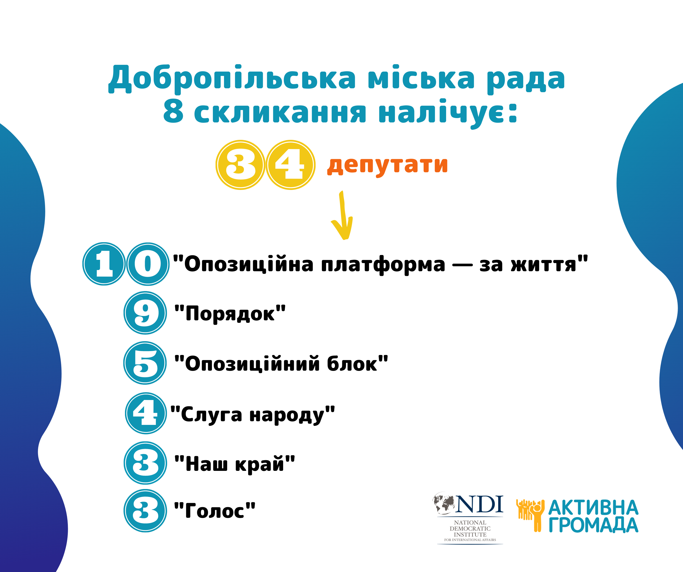 Під час чергових виборів міського голови та депутатів місцевої ради Добропільської ТГ 25 жовтня 2020 року було обрано 34 депутати. Склад ради представлено наступними партіями: