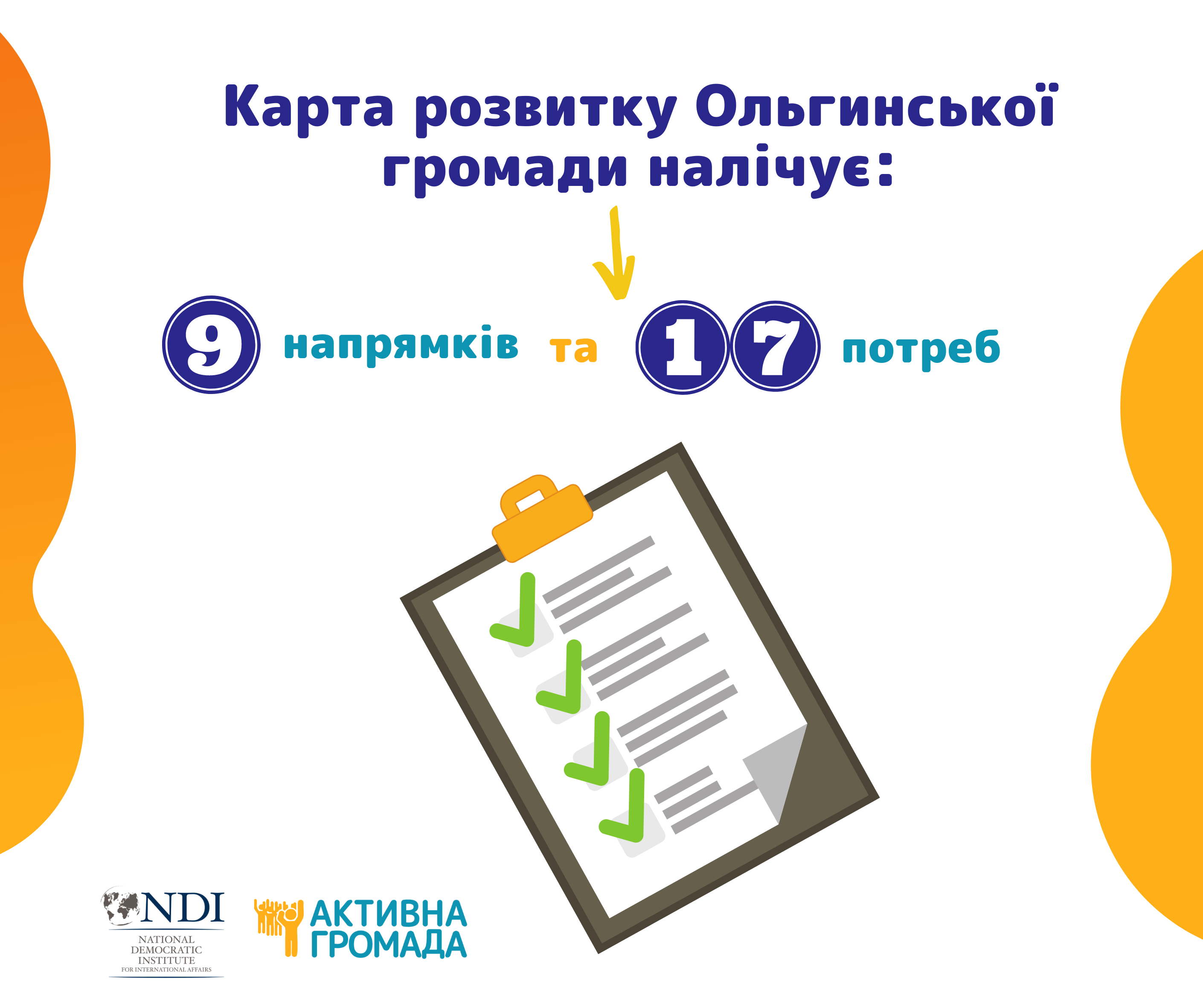 Нагадаємо що Карта Розвитку Громади була сформована у 2020 році шляхом опитування мешканців громади, обговорення та визначення пріоритетів, потреб та налічує 9 напрямків, в яких прописано 17 потреб, які найчастіше всього згадували мешканці.