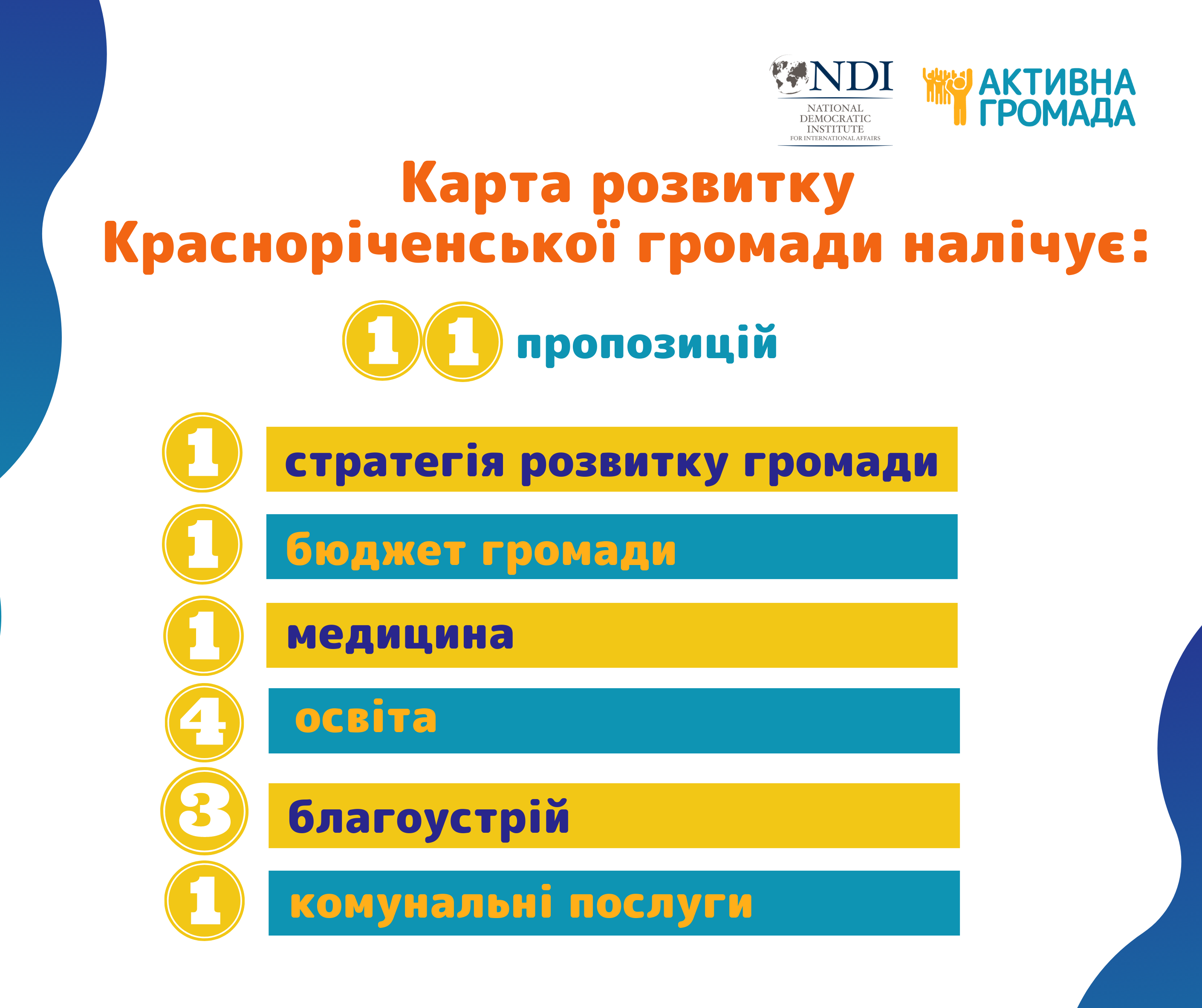 «Карта розвитку громади» Красноріченської ОТГ налічує 11 пропозицій, «Стратегія розвитку громади» – 1, «Бюджет громади» – 1, «Медицина» – 1, «Освіта» – 4, «Благоустрій» – 3, «Комунальні послуги» – 1.