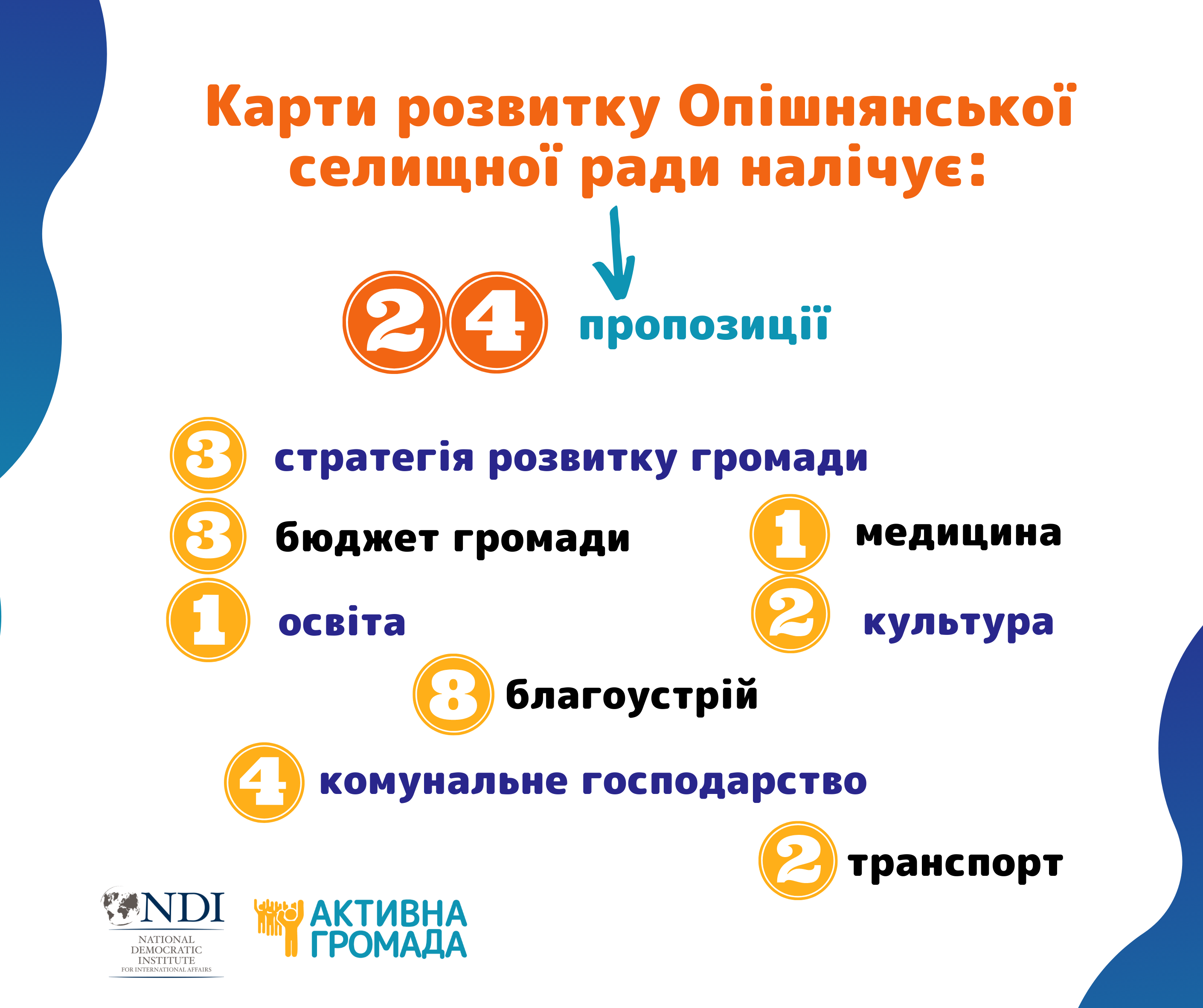 В рамках проєкту «Задай курс владі» була створена Опішнянська «Карта розвитку громади» до складу якої входить 24 пункти.
