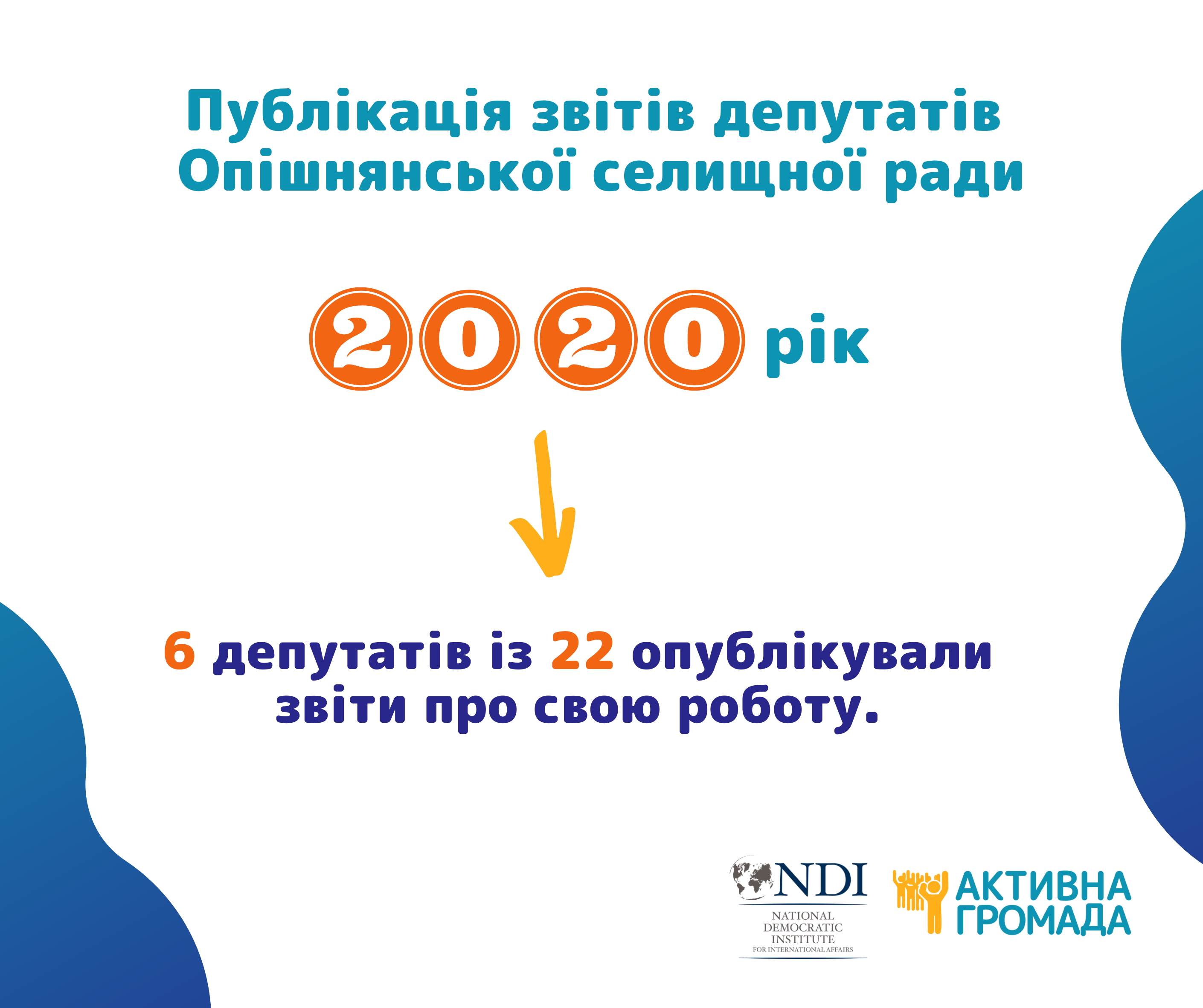 Виходячи з аналізу, із 22 депутатів Опішнянської селищної ради у 2020 році прозвітувало 6 (27,27%). «Слуга Народу» – 2 депутати, «За майбутнє» – 1 депутат, Самовисуванці – 3 депутати.