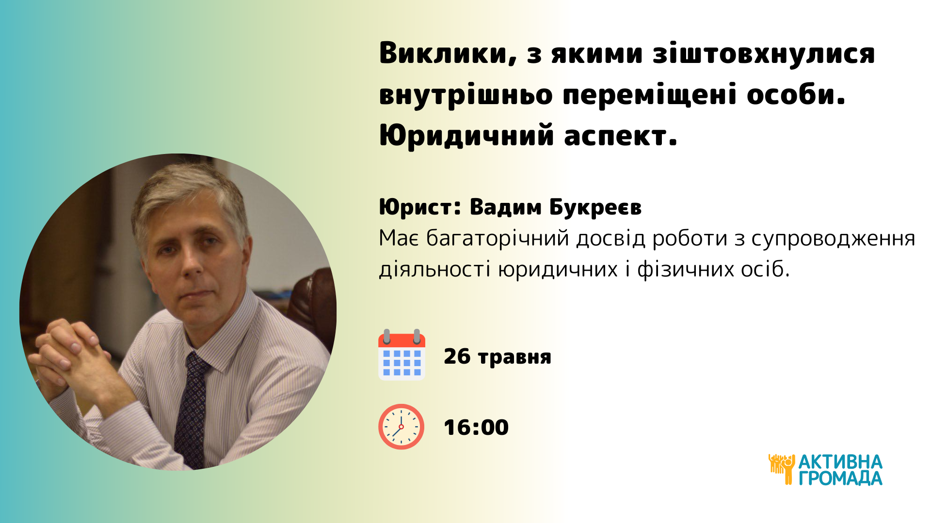 Запрошуємо вас на лекцію “Виклики, з якими зіштовхнулися внутрішньо переміщені особи. Юридичний аспект”.