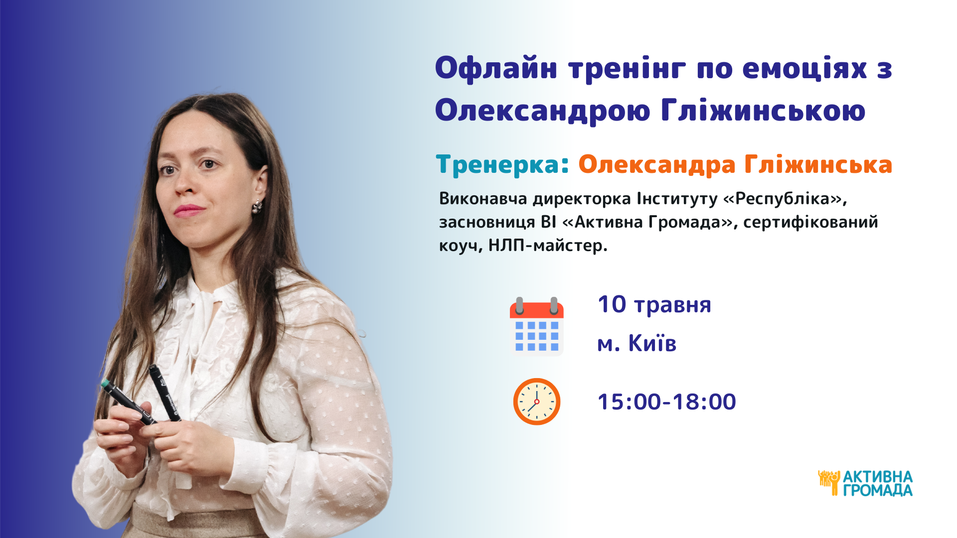 Тренерка: Олександра Гліжинська, виконавча директорка Інституту “Республіка”, засновниця ВІ “Активна Громада”, сертифікований коуч, НЛП-майстер.