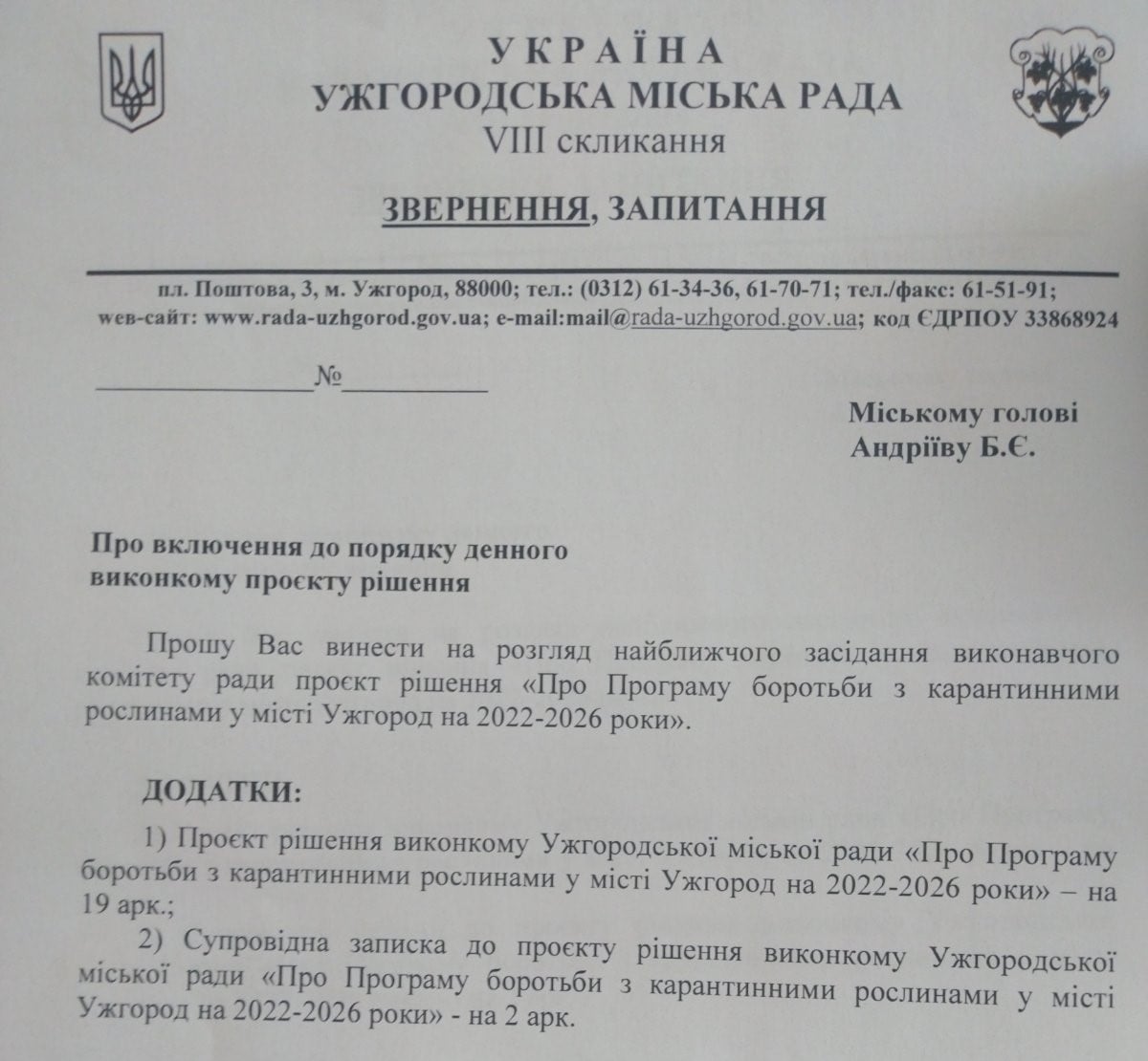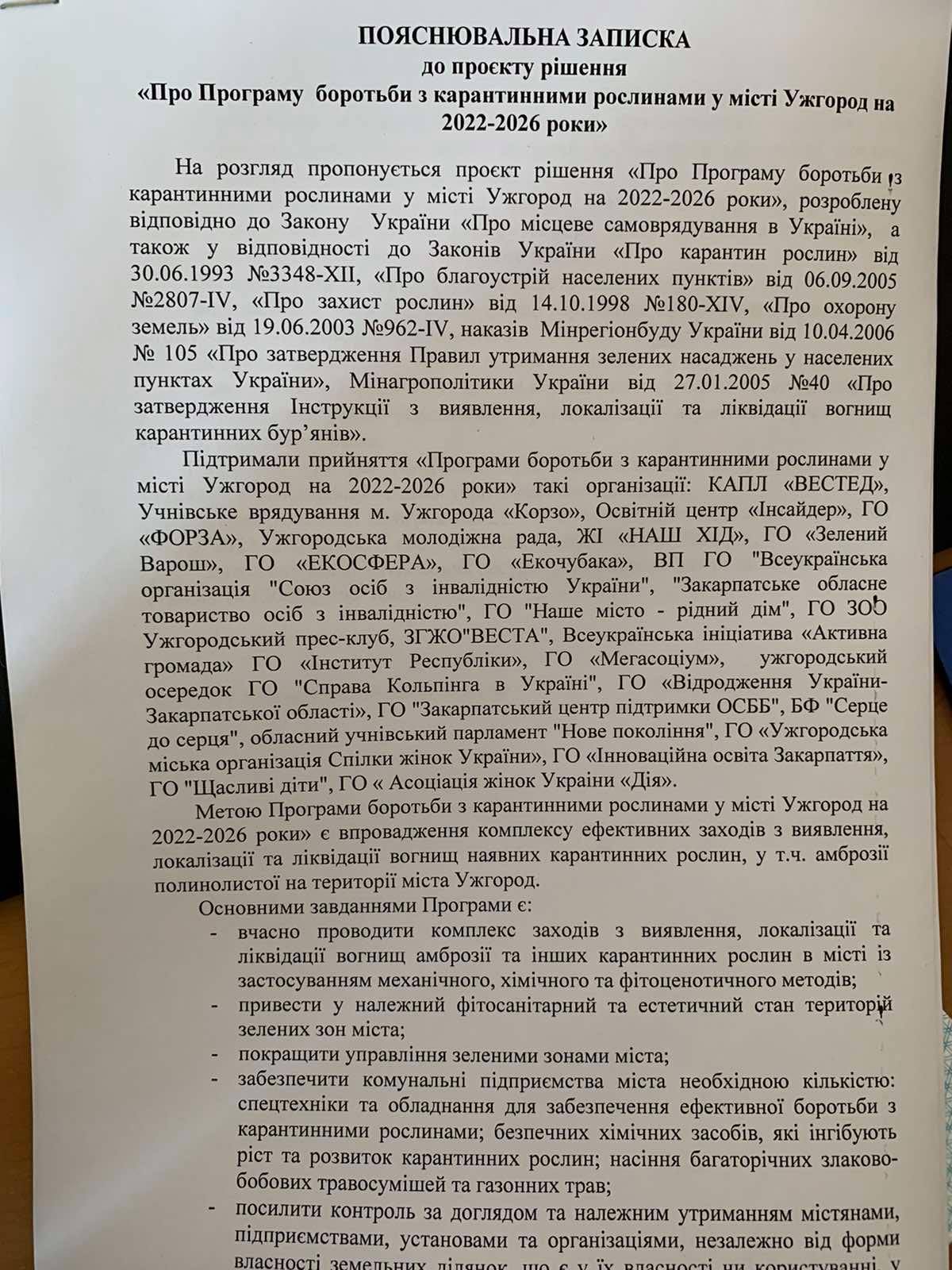 на розгляд міської ради внесено Програму боротьби з карантинними рослинами у м. Ужгороді на 2022-2026 рр. ініційовано групою громадян у співпраці з широкою коаліцією громадських організацій та ініціатив. Цьому передували зустрічі ініціативної групи, круглий стіл, виробництво кіно (АГ), розробка проекту програми, кулуарні бесіди з депутатами та службовцями Ужгородської міської ради