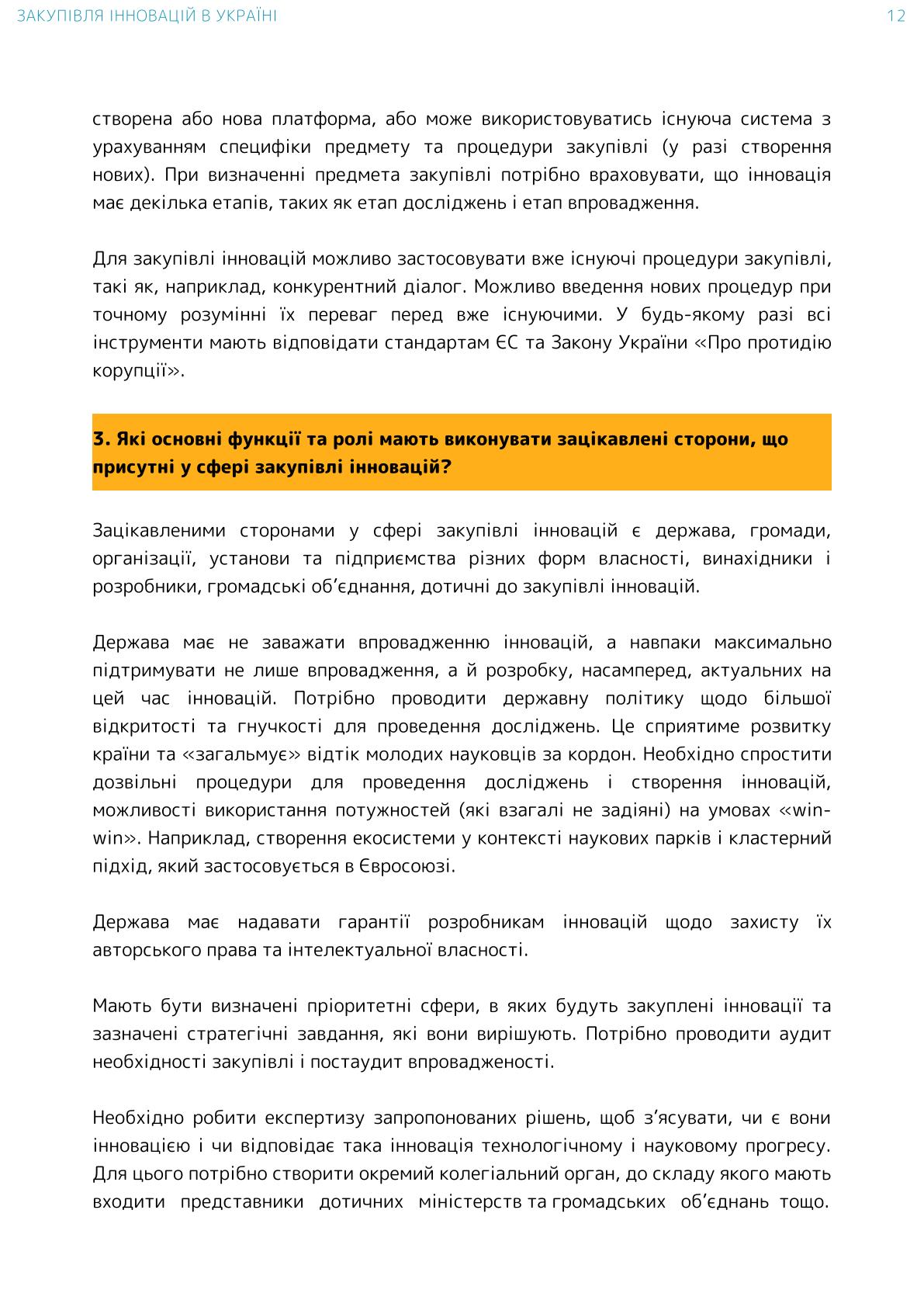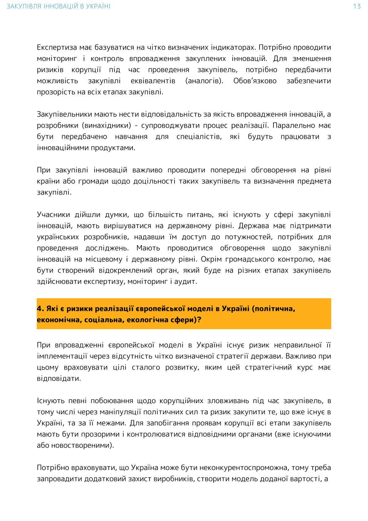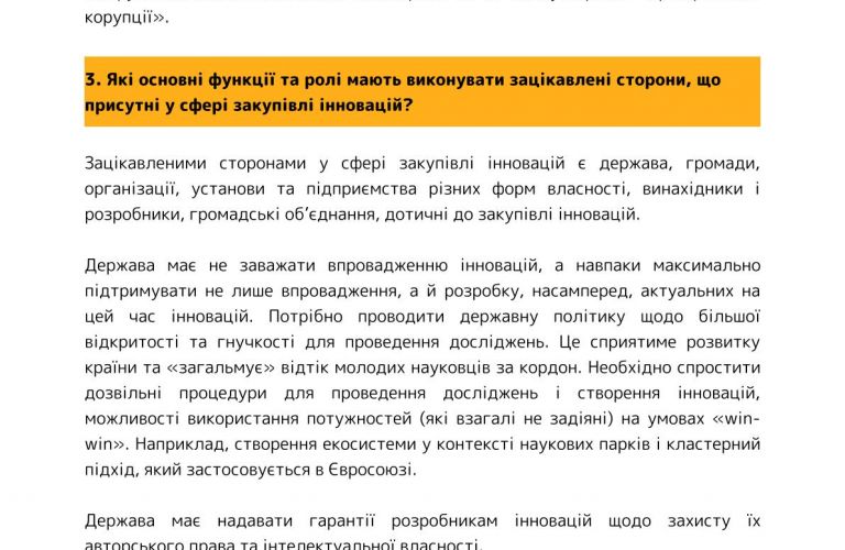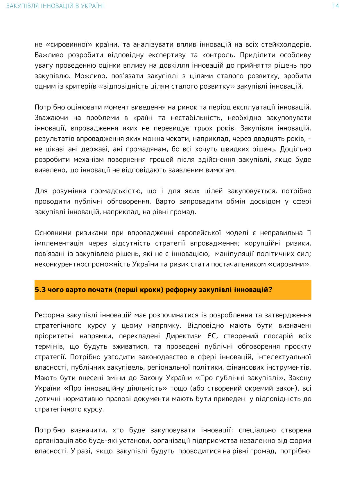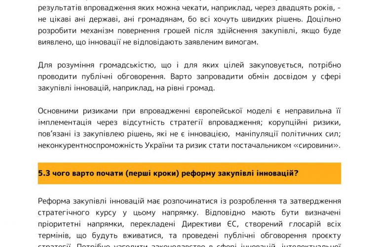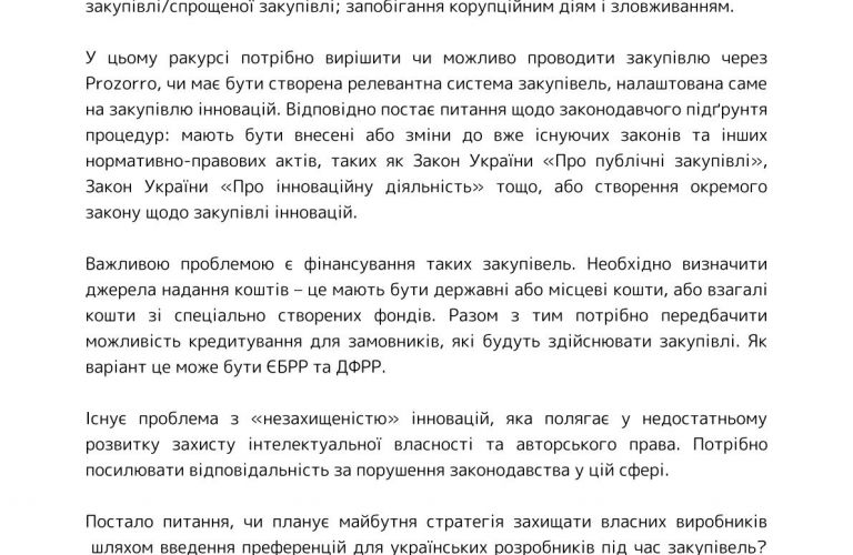 В Україні ж на сьогодні майже відсутня практика державної закупівлі інновацій. Державні установи не довіряють інноваційним рішенням як таким, не дбають про рівень безпеки цих розробок, оскільки часто глибоко не досліджують їх користь.