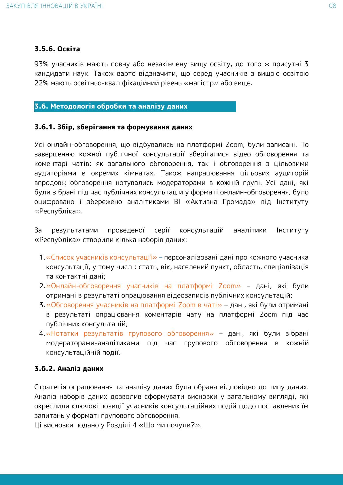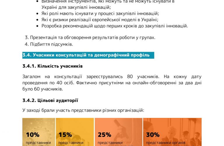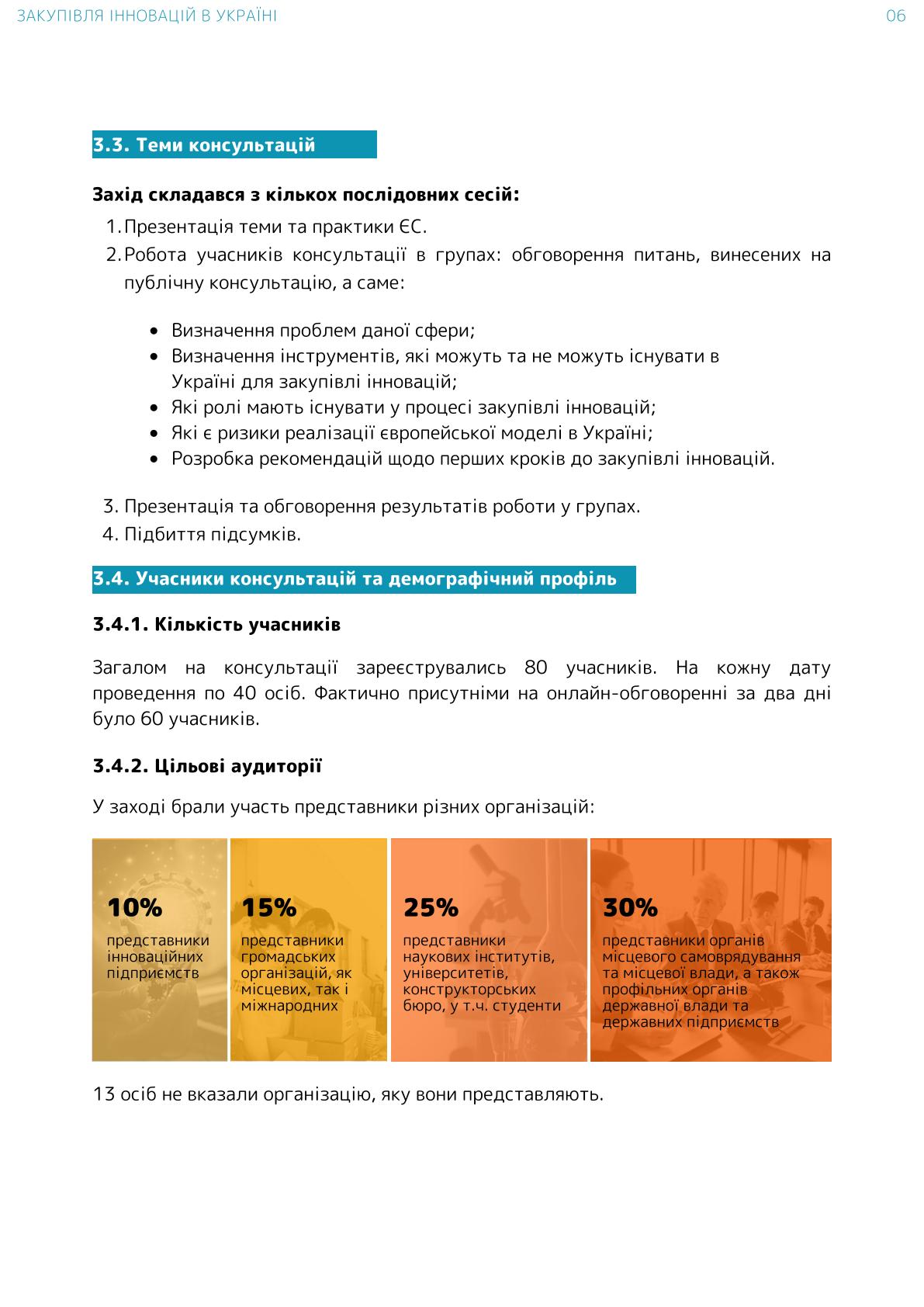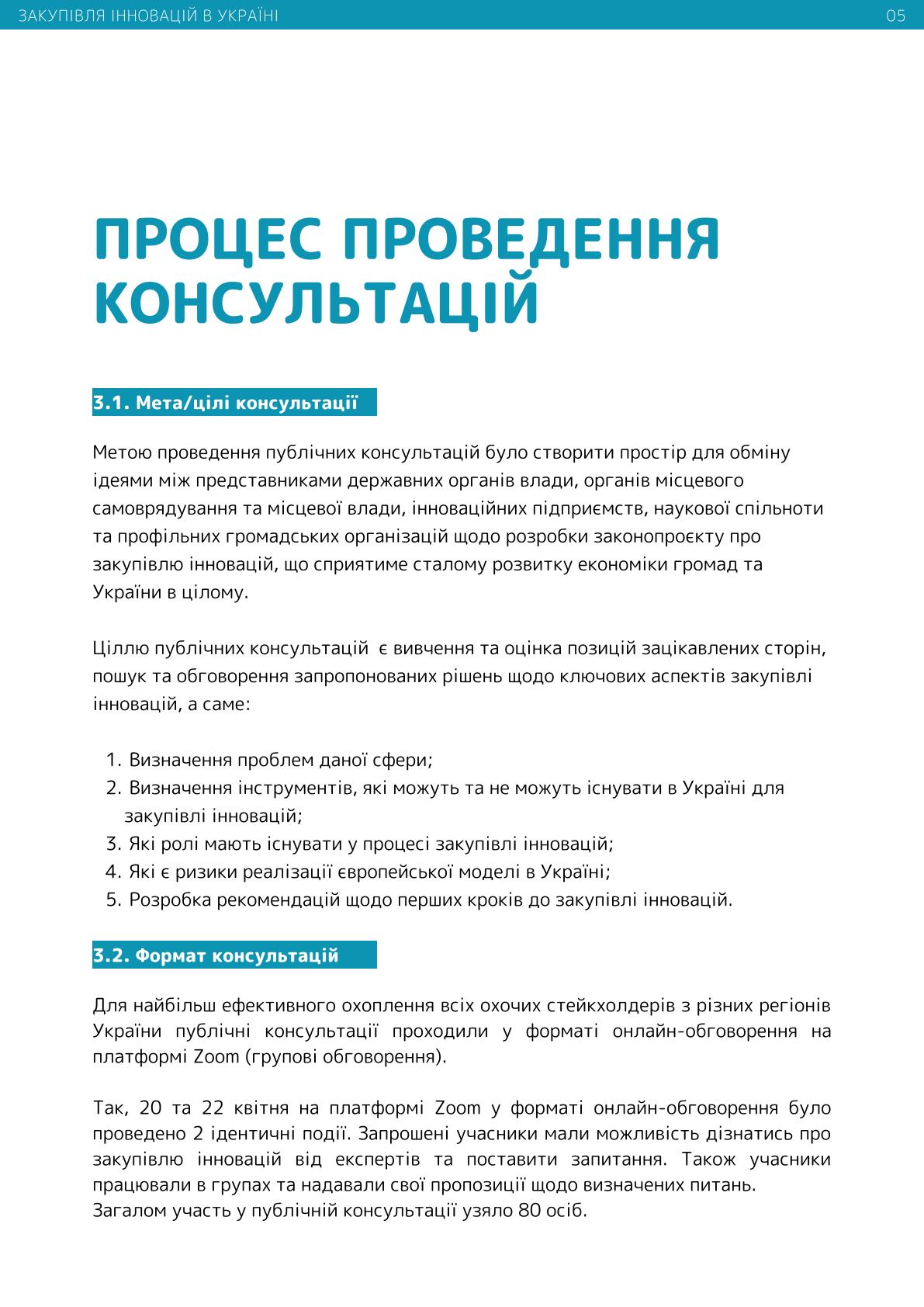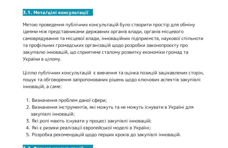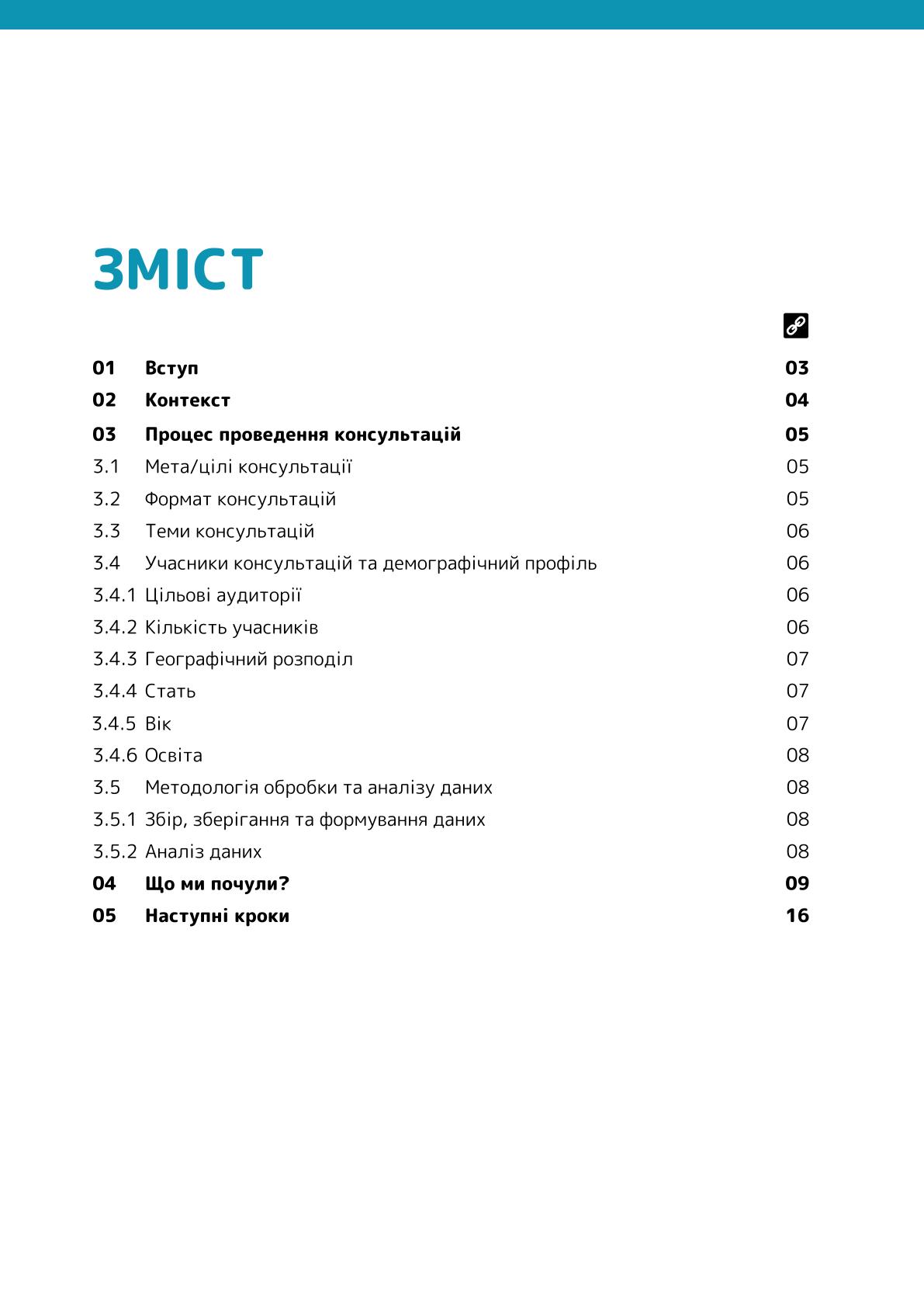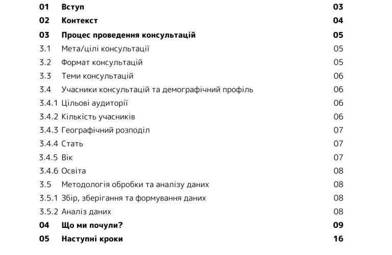 У цьому документі представлено детальний опис етапів підготовки, методології організації та проведення публічних консультацій, аналіз масиву даних, отриманих з урахуванням пропозицій, зауважень та коментарів цільових груп, напрацьованих під час їх роботи в групах.