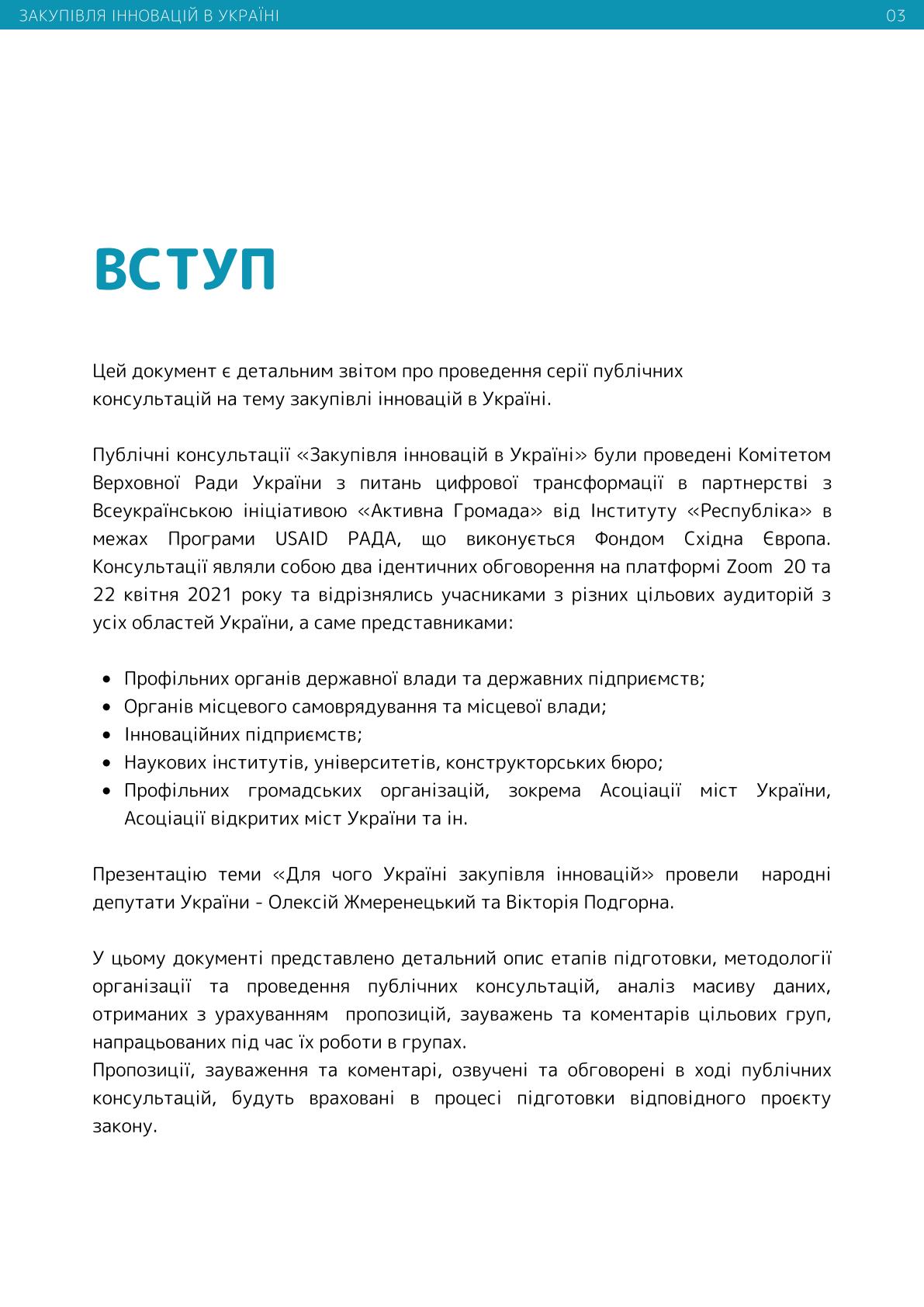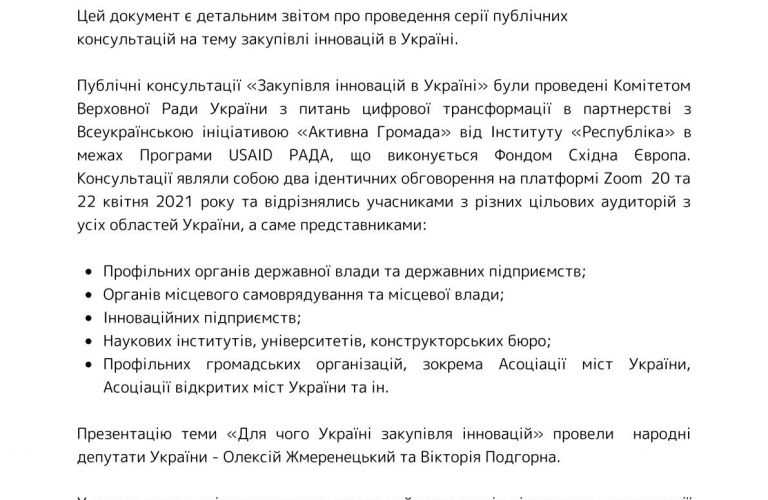Публічні консультації «Закупівля інновацій в Україні» були проведені Комітетом Верховної Ради України з питань цифрової трансформації в партнерстві з Всеукраїнською ініціативою «Активна Громада» від Інституту «Республіка» в межах Програми USAID РАДА, що виконується Фондом Східна Європа.