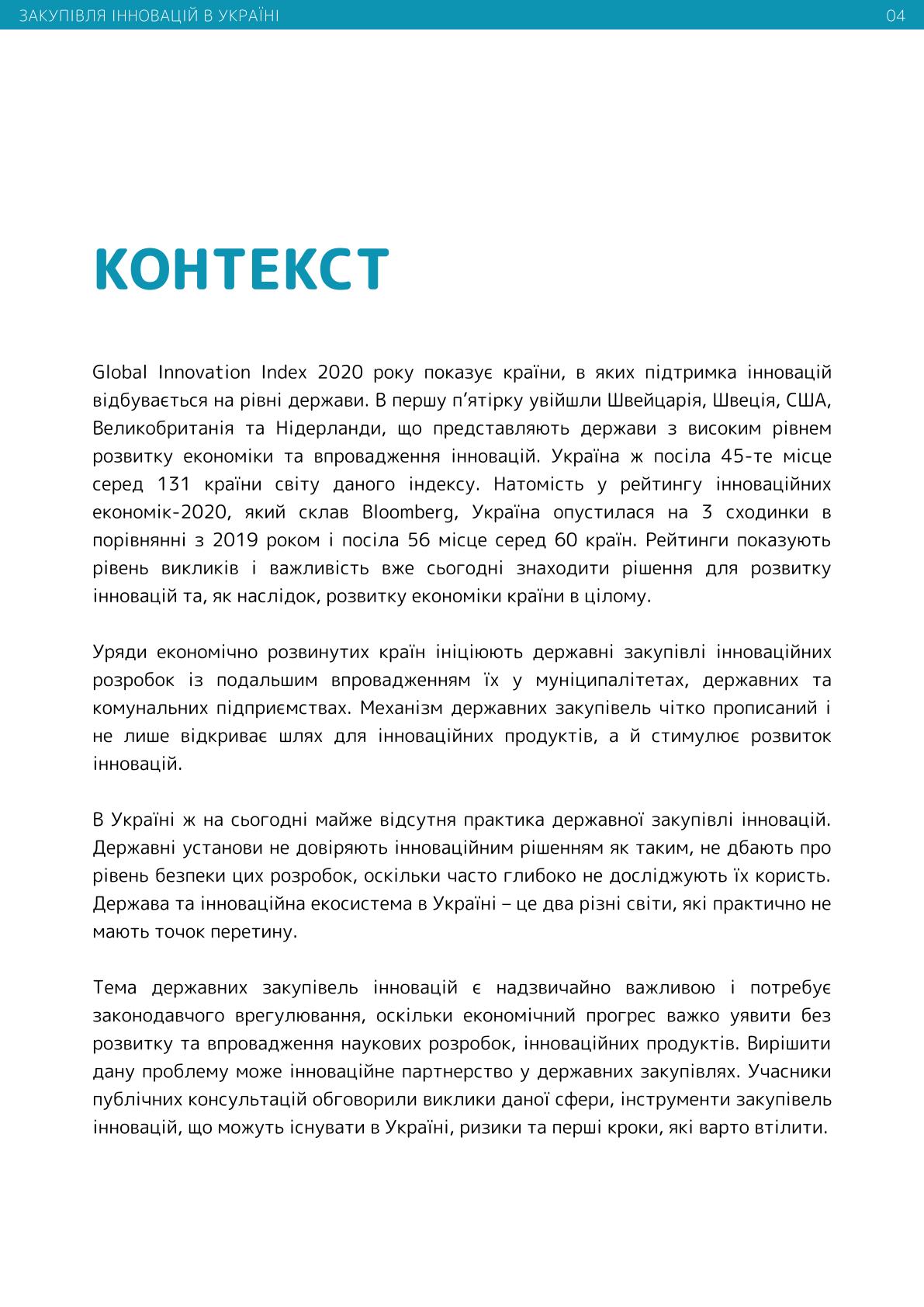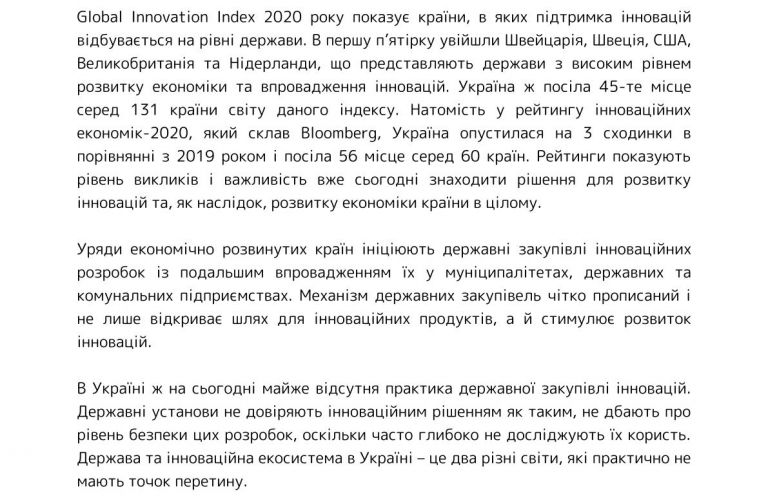 розвитку економіки та впровадження інновацій. Україна ж посіла 45-те місце серед 131 країни світу даного індексу. Натомість у рейтингу інноваційних економік-2020, який склав Bloomberg, Україна опустилася на 3 сходинки в порівнянні з 2019 роком і посіла 56 місце серед 60 країн. Рейтинги показують рівень викликів і важливість вже сьогодні знаходити рішення для розвитку