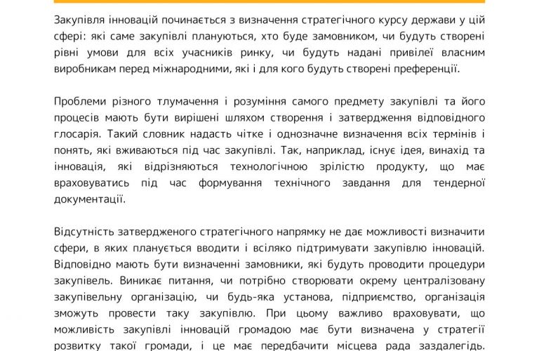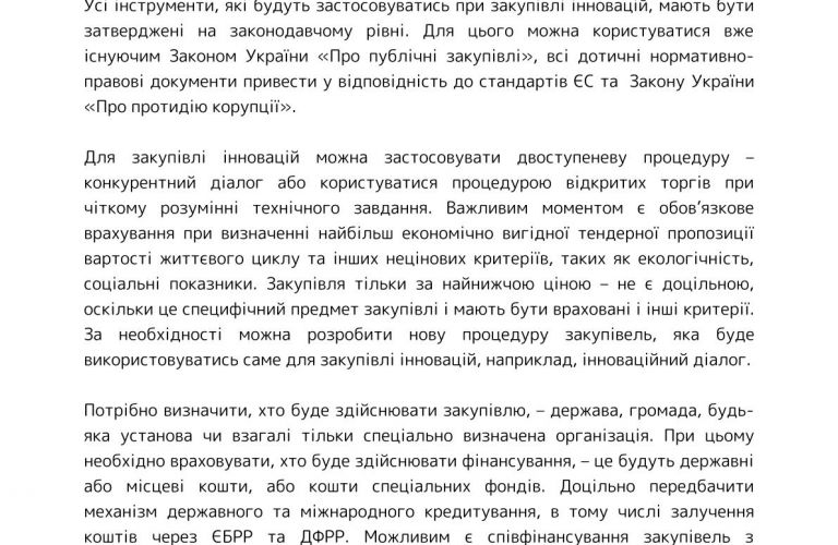 Уряди економічно розвинутих країн ініціюють державні закупівлі інноваційних розробок із подальшим впровадженням їх у муніципалітетах, державних та комунальних підприємствах. Механізм державних закупівель чітко прописаний і не лише відкриває шлях для інноваційних продуктів, а й стимулює розвиток інновацій.