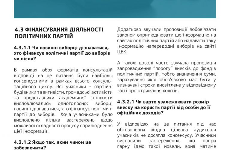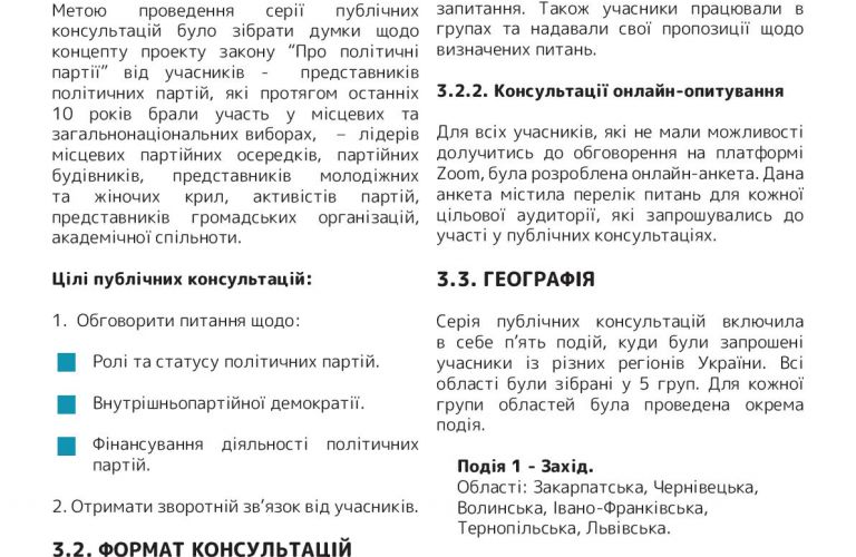 Всього відбулось п’ять таких подій з обговоренням на платформі Zoom за участі представників цільових аудиторій з усіх областей України. До серії публічних обговореннях долучилися 173 учасники/ці. Серед учасників були громадські активісти, активісти політичних партій, партійні будівники, науковці та представники академічної спільноти. Зазначимо, що після консультаційних подій додатково запускалася онлайн форма для збору ідей учасників, які не потрапили на події в Zoom.