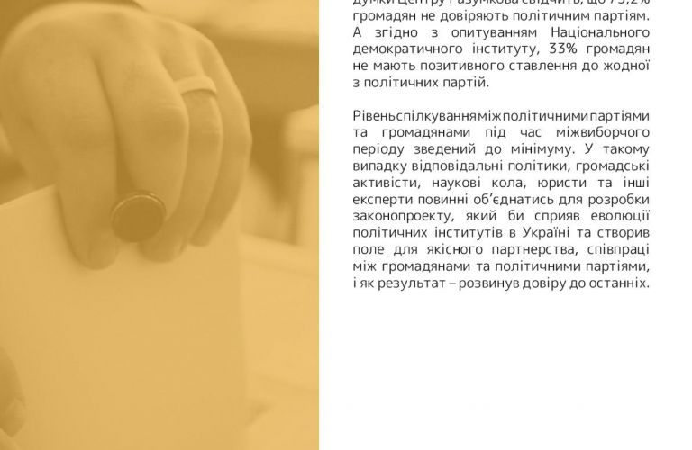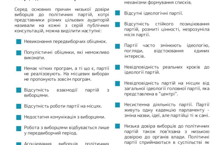 Протягом грудня 2020 року тривали публічні консультації щодо розробки закону “Про політичні партії”. Вони були організовані та проведені робочою групою Верховної Ради України в партнерстві з Всеукраїнською ініціативою “Активна Громада” та Центром політико-правових реформ за сприяння Національного демократичного інституту й Міжнародної фундації виборчих систем (IFES) та завдяки підтримці Агентства США з міжнародного розвитку (USAID), міністерства міжнародних справ Канади та британської допомоги від уряду Великої Брита