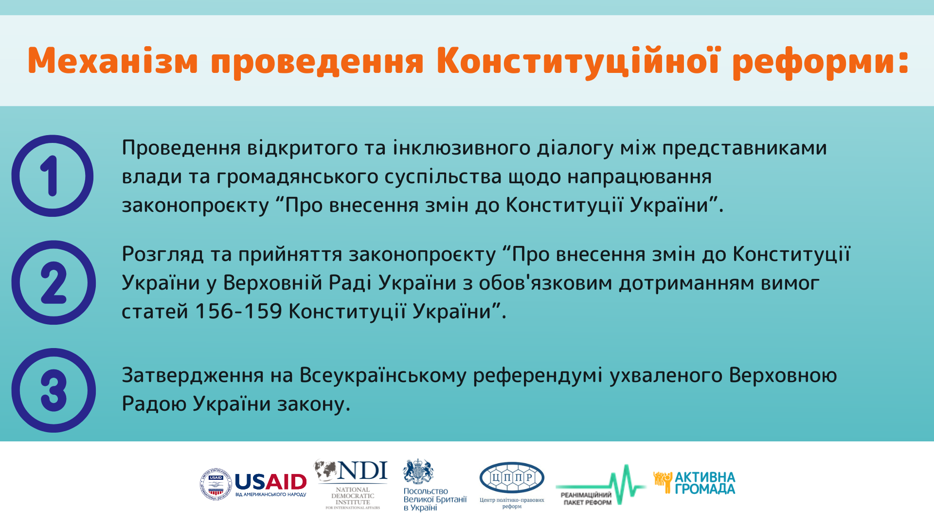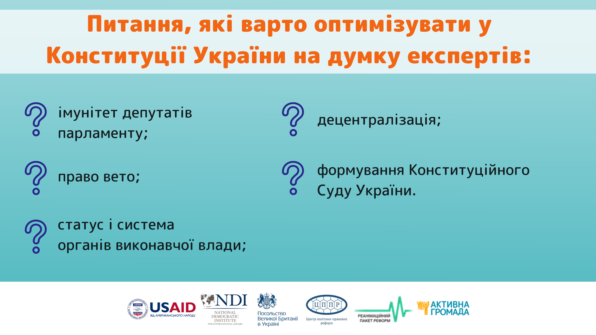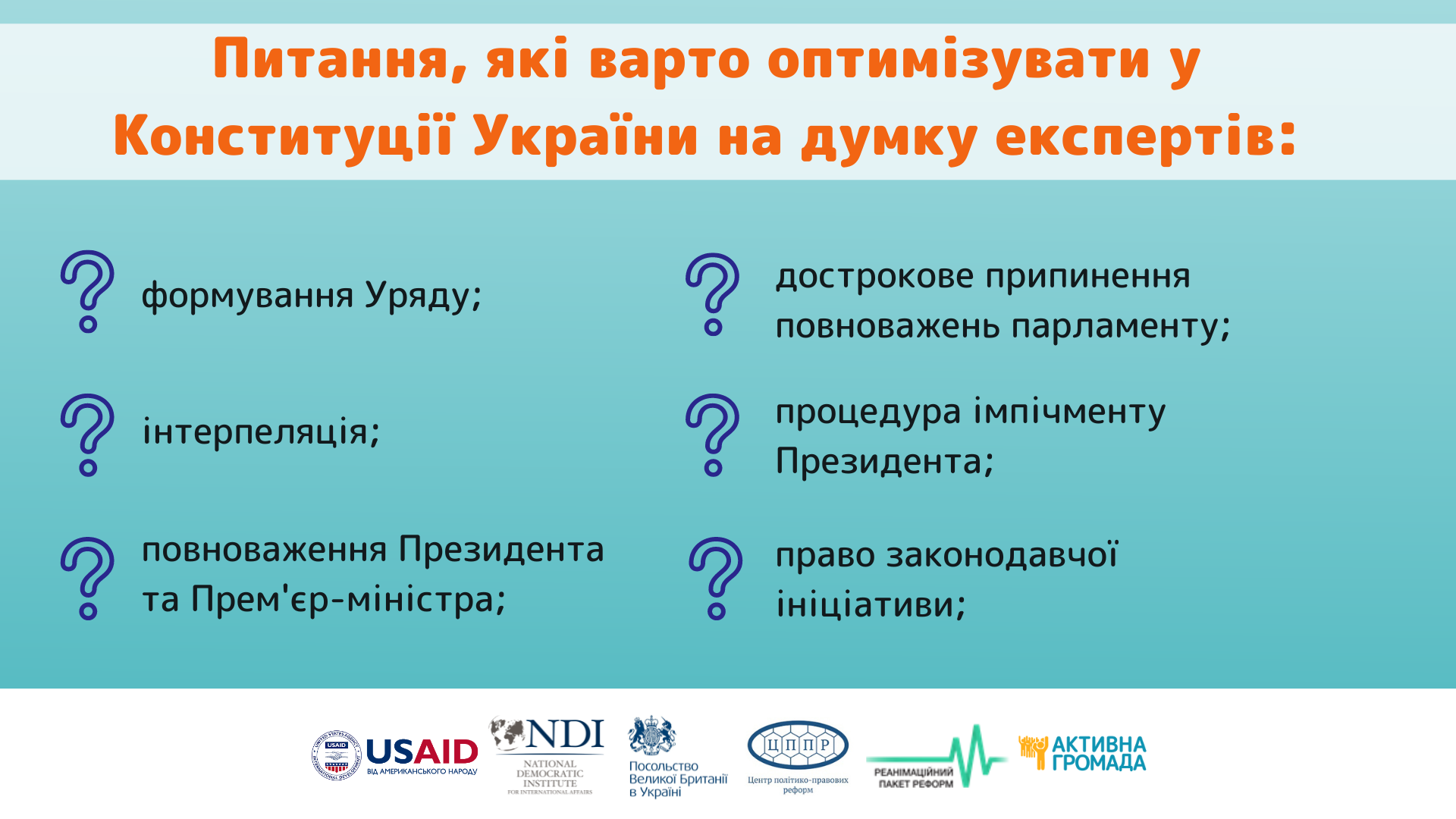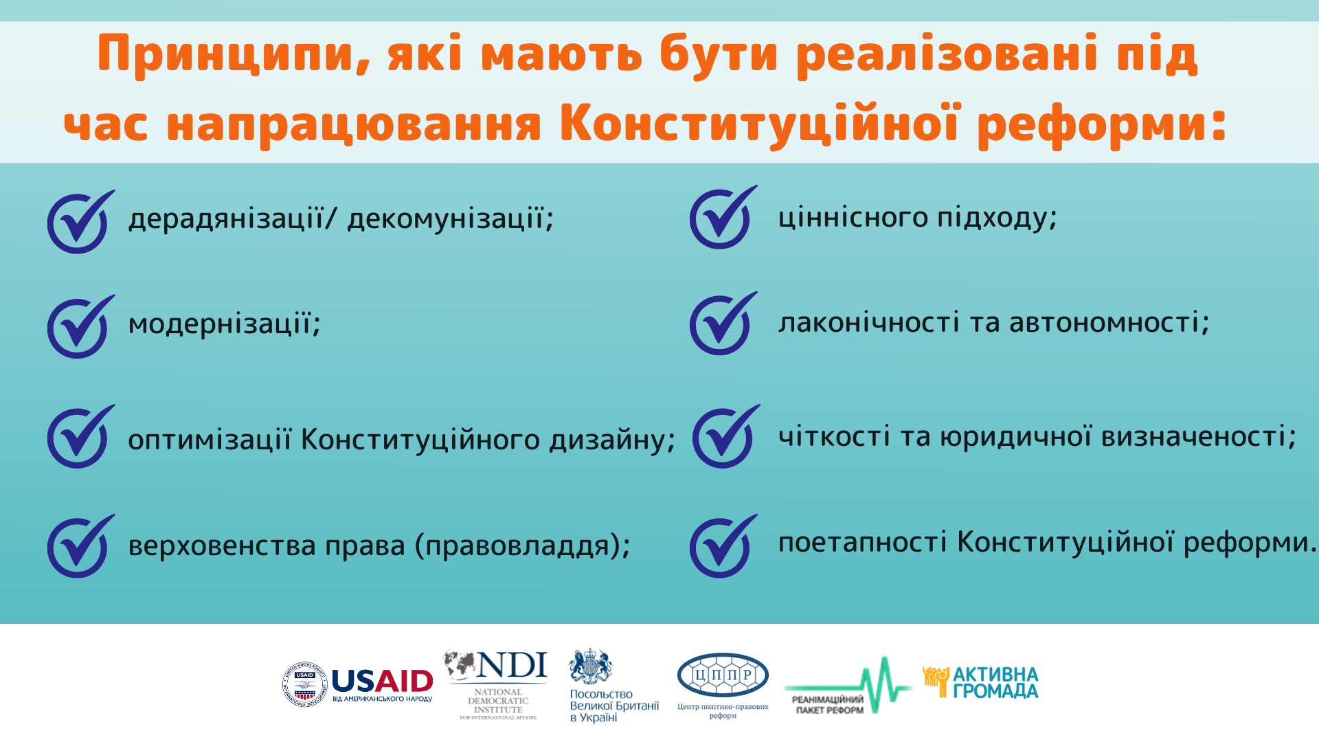 Конституційна реформа займає пріоритетне місце у всеосяжному процесі реформування в Україні. Забезпечення надійного захисту прав людини та її основних свобод, формування збалансованої системи представницької демократії, зміцнення парламентаризму, побудова ефективної системи стримувань і противаг, створення дієвих механізмів прямої демократії – це кінцева мета Кконституційного реформування в Україні.