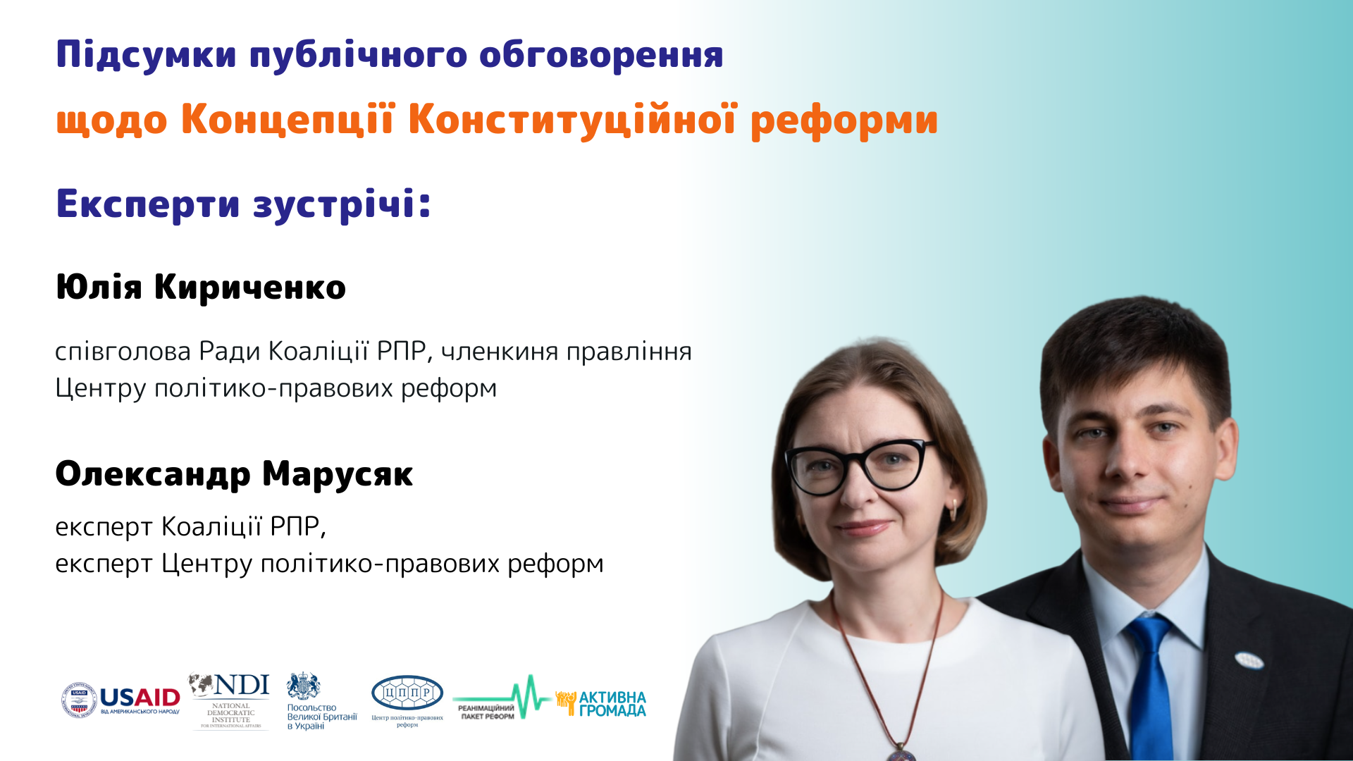 “Активна Громада” разом з Коаліцією “Реанімаційний Пакет Реформ” та у партнерстві з Центром політико-правових реформ в межах проєкту “Україна після перемоги: підготовка та комунікація реформ для реалізації “Бачення України - 2030”” за фінансової підтримки Уряду Великої Британії проводить публічні обговорення.