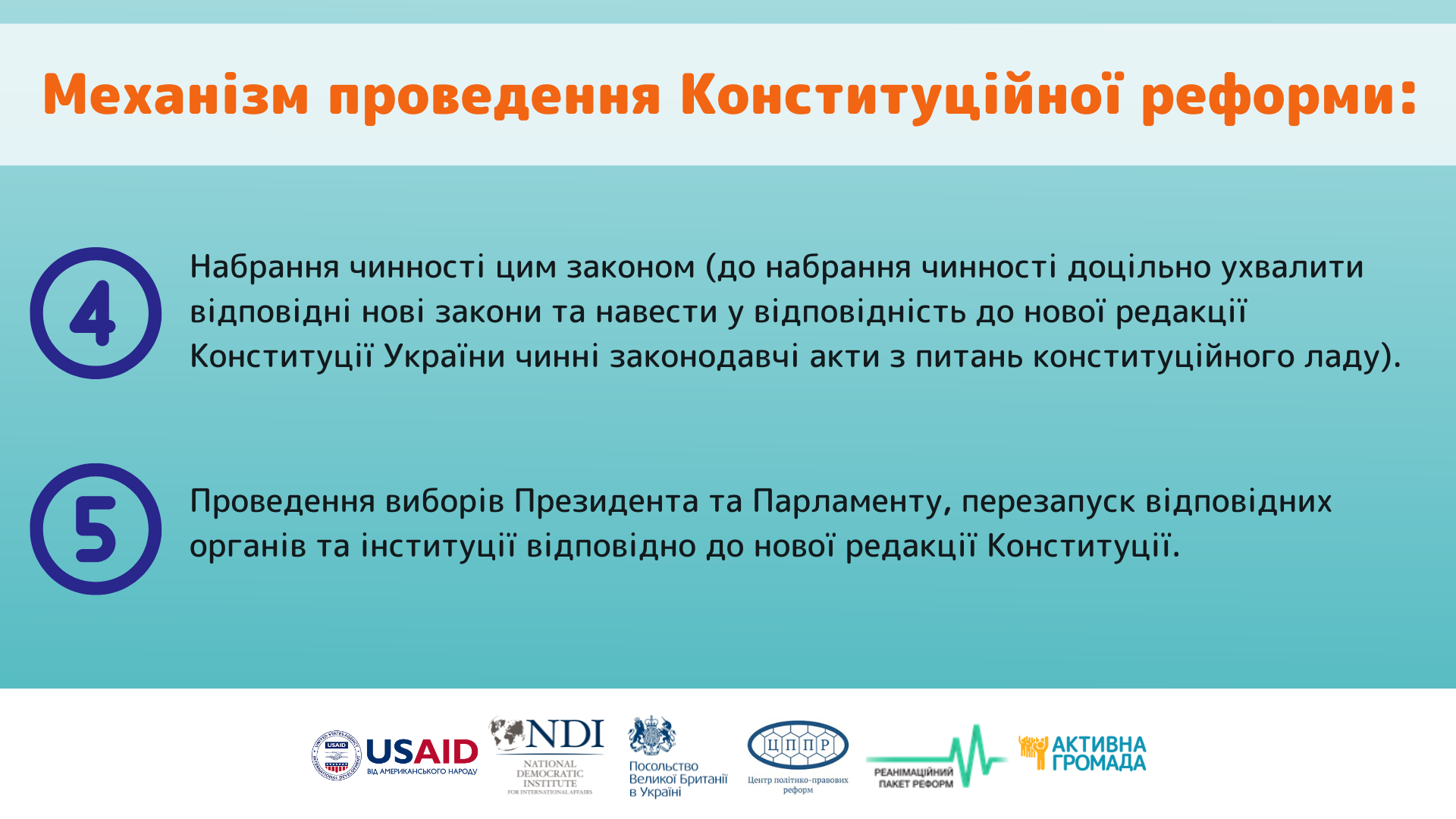 Набрання чинності нової редакції змін Конституції не може відбутися одразу чи в один день, тому що воно буде потребувати переобрання виборних органів під нові повноваження та під нову редакцію (парламент, кількість членів у парламенті президент). Після воєнної перемоги не можна цього відкладати, але не варто це робити дуже швидко. Важливо забезпечити процес інклюзивного діалогу, долучення до напрацювання конституційних змін саме найкращих експертів, а не людей за політичною прихильністю.