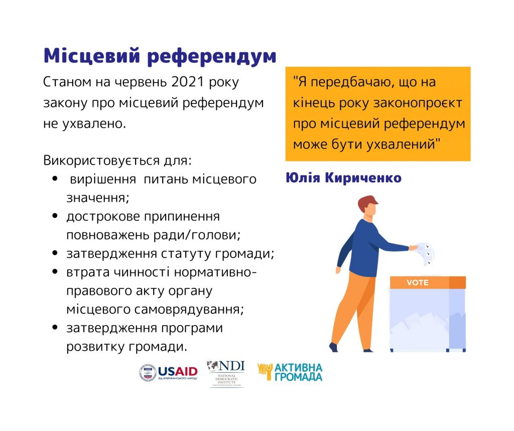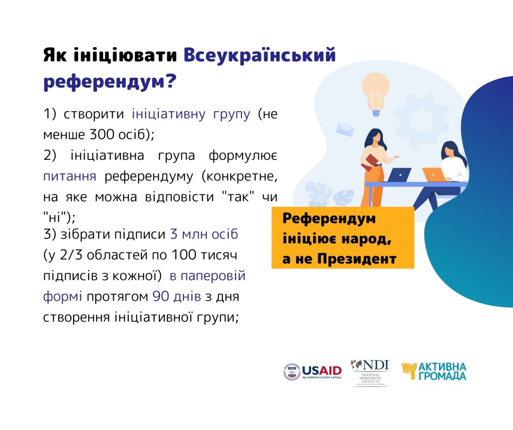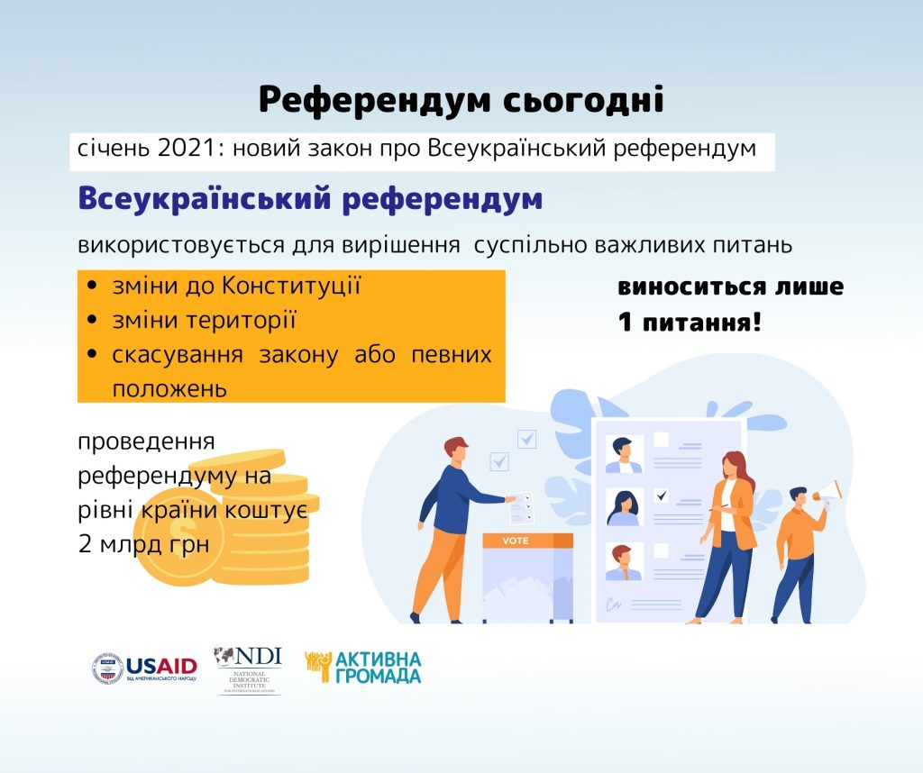 Підсумуємо: Національний референдум — спосіб прямого волевиявлення народу щодо суспільно важливих питань. Організація цього заходу вимагає великих грошей, тому на референдум виноситься лише одне актуальне питання. Ініціювати національний референдум може лише народ, але не президент. Голова держави виконує символічну роль, оголошуючи проведення заходу. Місцевий референдум стосується питань місцевого значення, тобто є інструментом громади.
