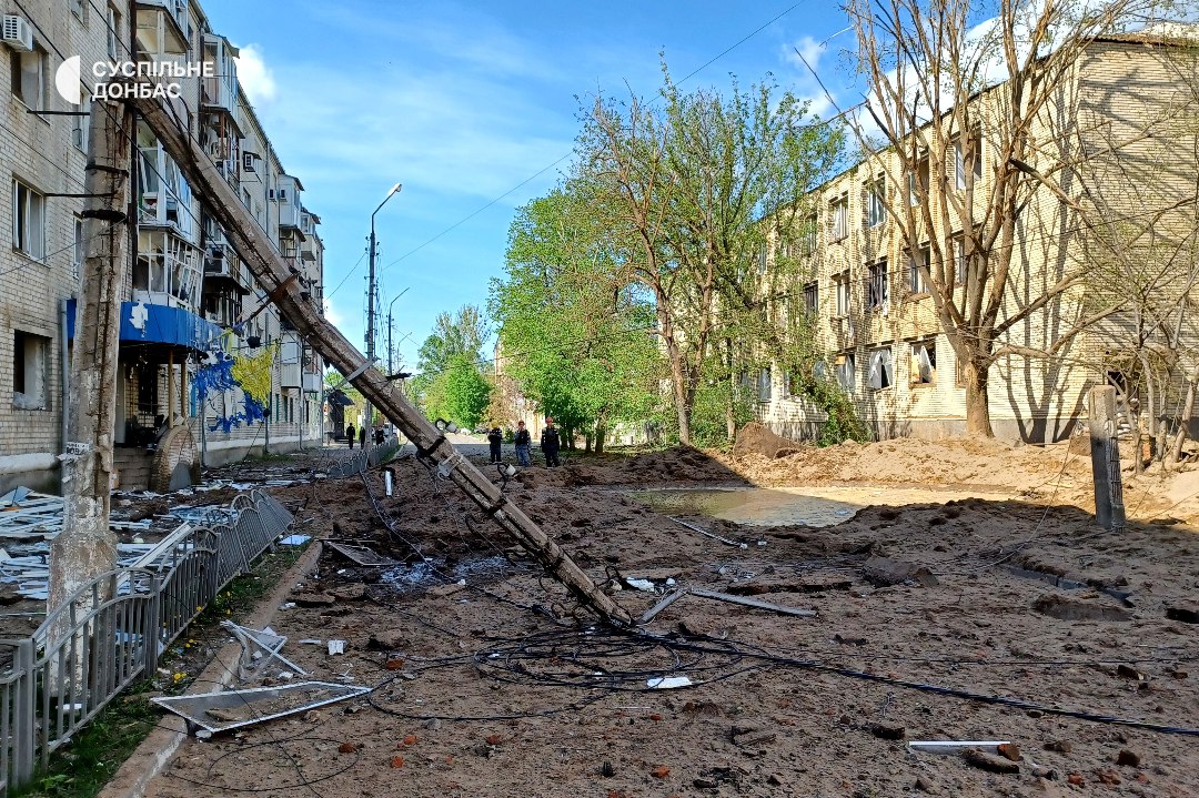 Армія рф обстріляла Слов'янськ зранку 15 квітня, ракета-бомба "Грім-Е1" поцілила в середмістя, руйнувань зазнали два багатоквартирних будинки, заклад освіти, будівля банку та шість цивільних автомобілів.