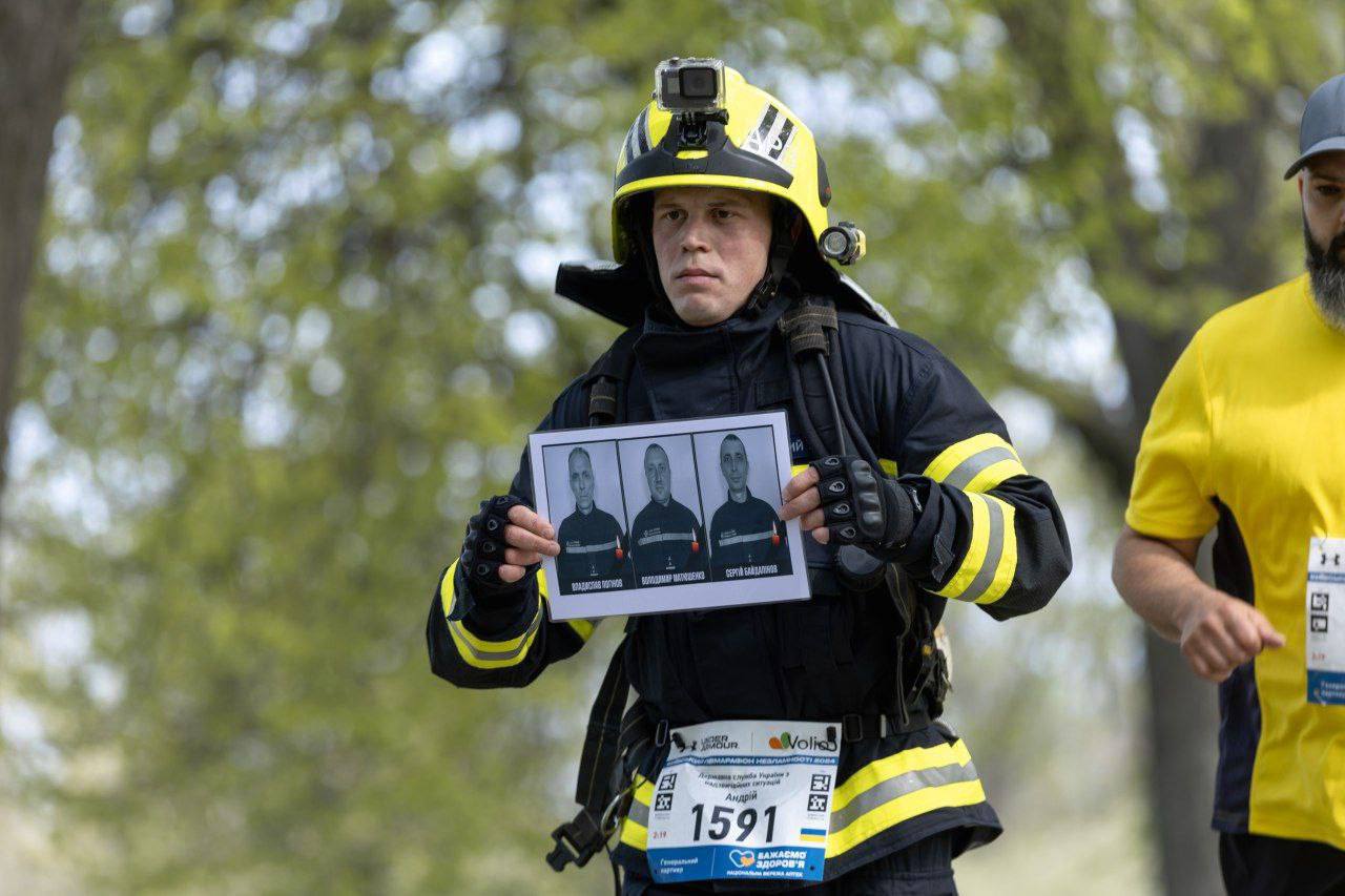 Рятувальник пробіг 21 км у спорядженні на півмарафоні Незламності в Києві. Свій забіг він присвятив загиблим колегам із Харкова, яких вбила рф під час подвійного удару по місту. Вага такого спорядження сягає до 25 кг.
