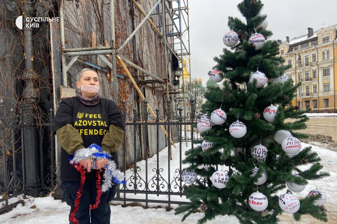 У Києві родичі полонених захисників «Азовсталі», а також інших військових та цивільних, яких утримує росія, вийшли на акцію на Софійську площу. Вони встановили там свою ялинку в межах флешмобу «Свято без свята».