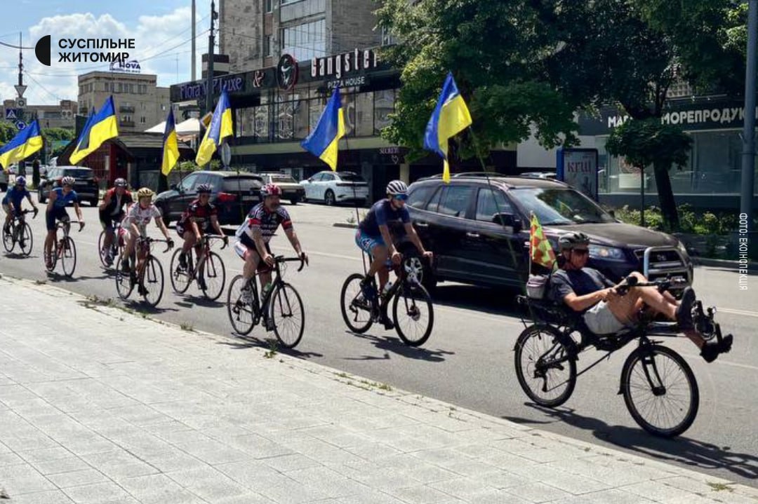 У Житомирі зустріли волонтера із Франції Емманюеля Бюе, який їде на велосипеді із Парижа до Києва, аби зібрати гроші на оснащення класів у бомбосховищі однієї із українських шкіл.