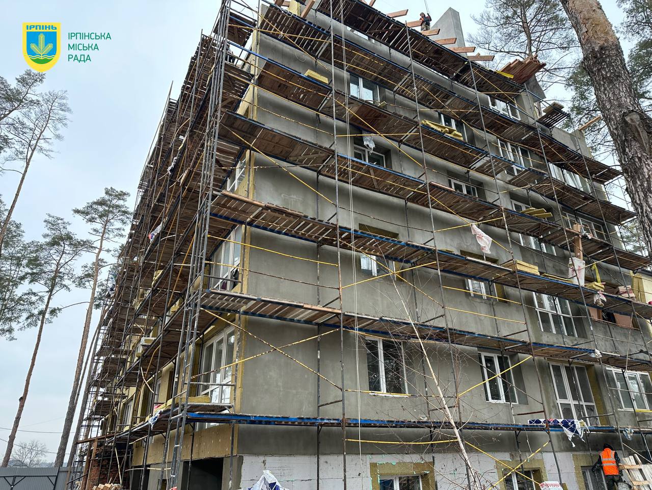 В Ірпені капітально ремонтують багатоповерхівку, в якій проживало понад 40 родин. Вона була пошкоджена внаслідок повномасштабного вторгнення. Експерти оцінили її як об'єкт із II категорією руйнувань. Завершення відбудови заплановане на IV квартал цього року.