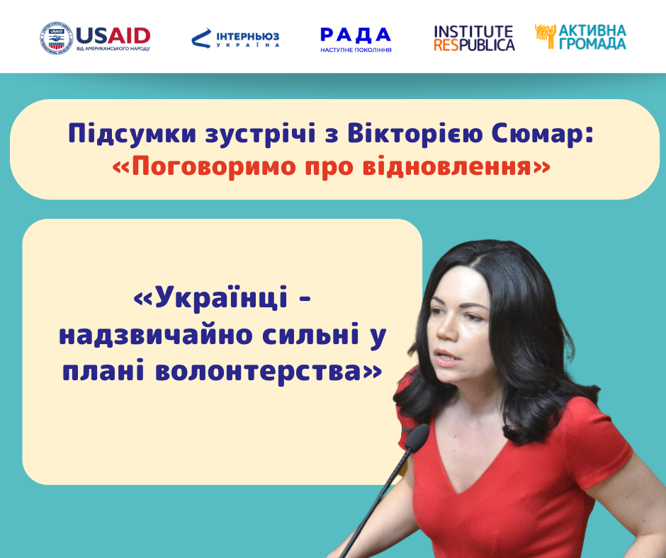 Про проєкт: участь у заходах сприяє підвищенню рівня обізнаності населення про функції депутатів ВРУ, методів взаємодії з ними та обговорення плану відновлення і розвитку країни у воєнний та повоєнний період. Також - сприятиме розвитку діалогу між депутатами ВРУ та громадянами щодо розробки проєктів законів щодо відновлення за допомогою публічних консультацій.