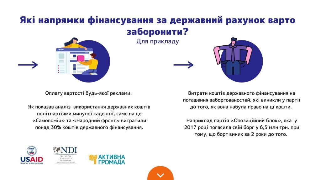 • Відсутність у законопроєкті вичерпного переліку того, на що кошти державного фінансування політичним партіям заборонено витрачати.