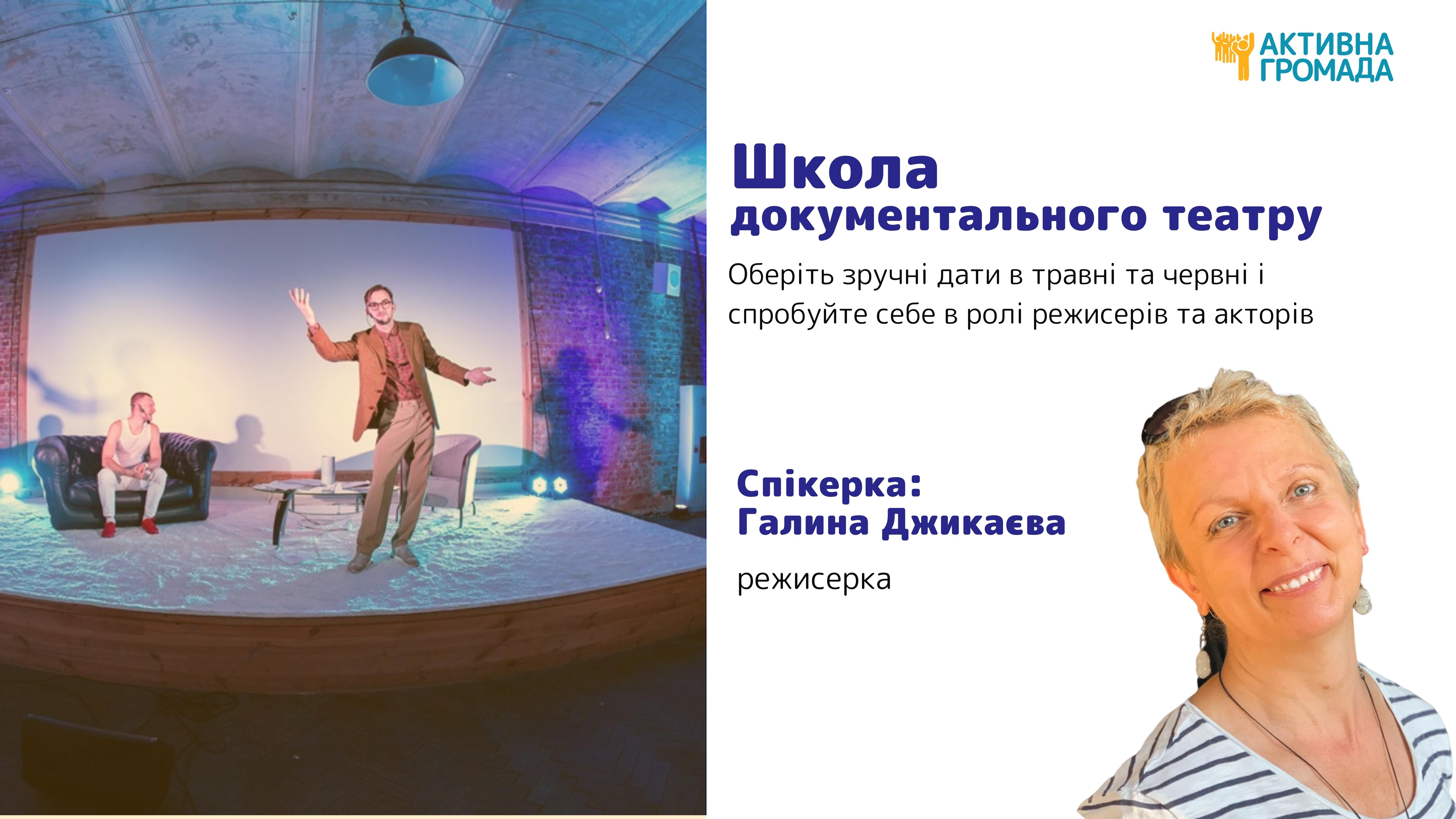 Якщо ви прагнете працювати на межі мистецтва та соціальних проєктів, запрошуємо долучитися до унікальної Школи документального театру і спробувати себе у ролі режисерів та акторів. Разом з учасниками ви поставите власну виставу онлайн.