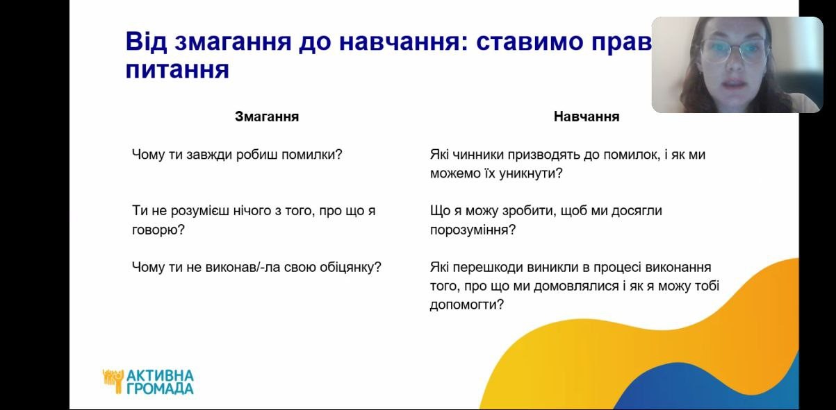 Аби краще зрозуміти відмінності у комунікаційних підходах учасники виконали практичну вправу, де спробували замінити змагальний підхід на навчальний. Зокрема, ставили відкриті питання та ті, які стосувалися особистого досвіду.