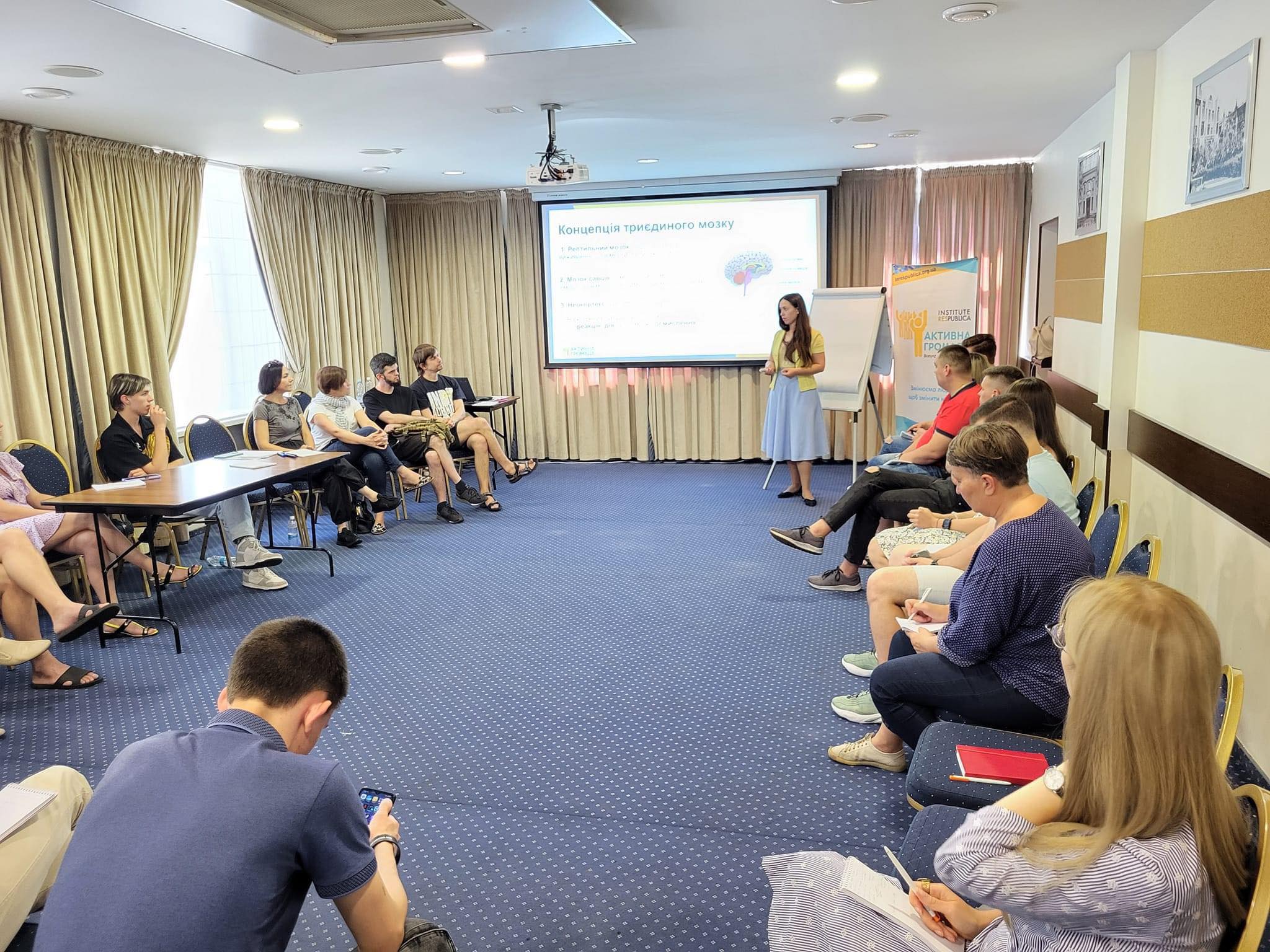 Олександра Гліжинська, виконавча директорка Інституту “Республіка”, засновниця ВІ “Активна Громада”, сертифікований коуч, НЛП-майстер, розповіла учасникам про психологію людей в кризовий період, неконфліктну комунікацію та методи ефективного управління часом.