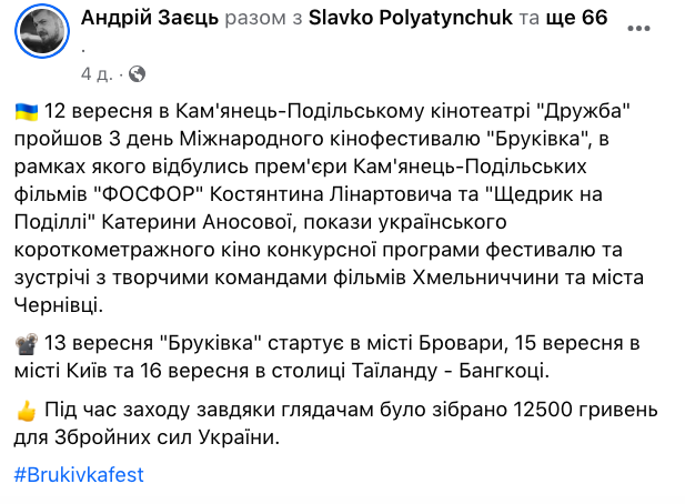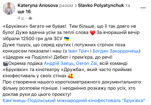 Вже 12 вересня, в рамках International Independent Film Festival Brukivka, відбувся премʼєрний показ нашого фільму, який має назву «Фосфор»! На прем’єрі ми зібрали на потреби ЗСУ, а конкретно, на дрон, в якого вже є ім’я «Бруківка», 12 500 грн!