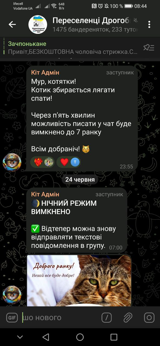 Потім ми стикнулися з тим, що чат трохи розрісся, десь було близько 500 людей в чаті, то почали долучатися шахраї з різними пропозиціями з ціллю витягнути з людей гроші. Бо люди, коли знаходяться у стресі, вони більш вразливі і довірливі. А чат називається «Переселенці Дрогобич», то по слову «переселенці» можна легко знаходити. Вручну ми не справлялися видаляти шахраїв, бо їх долучалося близько 50-ти на добу, ми буквально цілодобово видаляли різні повідомлення і писали, що не сприймайте якусь інформацію, яка іде не від адмінів, перевіряйте, питайте у нас, не реєструйтеся, не надавайте дані своїх карток. Ми зрозуміли, що з тим потрібно якось боротися. До нас долучився ще один хлопець, який за освітою ІТ-шник, і він написав нам бота на платній основі, ми досі ним користуємося, він захищає буквально від 95 відсотків шахрайства. Інші 5 – вручну.
