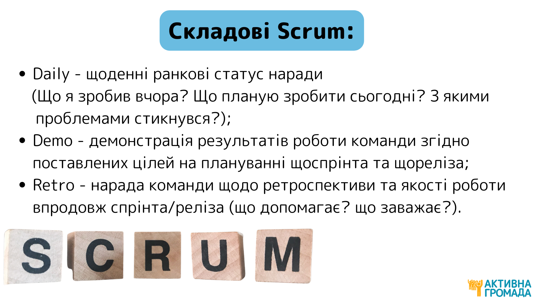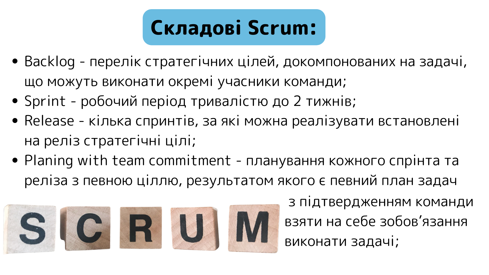 Scrum - це легкий фреймворк, що допомагає людям, командам та організаціям створювати цінність за допомогою адаптивних розв'язань комплексних проблем. Цілеспрямований на швидку розробку та постачання складних, принципово нових продуктів, яких ще нема на ринку.